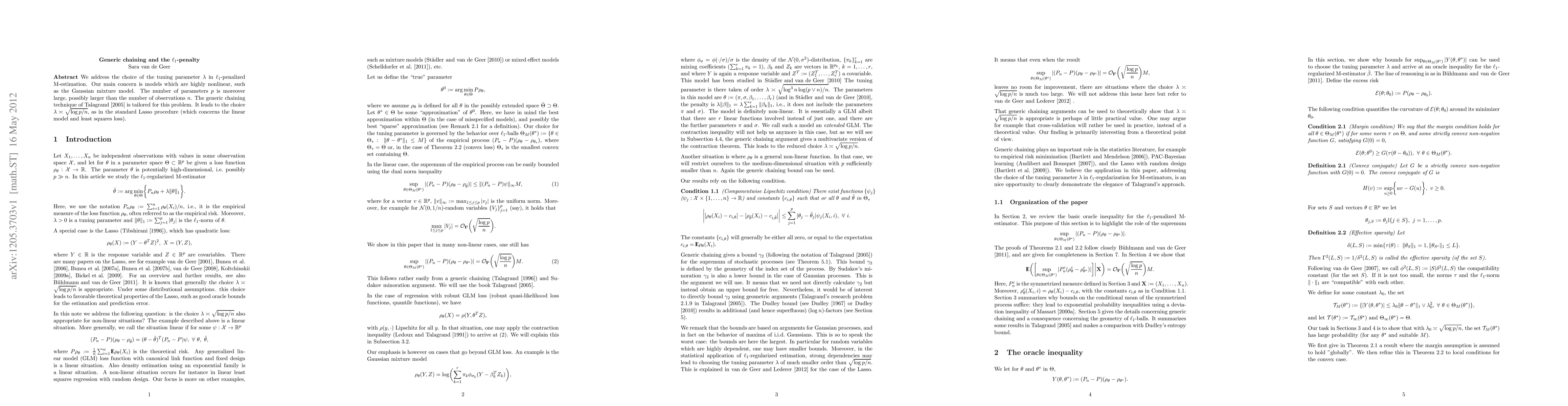 We address the choice of the tuning parameter $\lambda$ in $\ell_1$-penalized M-estimation. Our main concern is models which are highly nonlinear, such as the Gaussian mixture model. The number of parameters $p$ is moreover large, possibly larger than the number of observations $n$. The generic chaining technique of Talagrand[2005] is tailored for this problem. It leads to the choice $\lambda \asymp \sqrt {\log p / n}$, as in the standard Lasso procedure (which concerns the linear model and least squares loss).