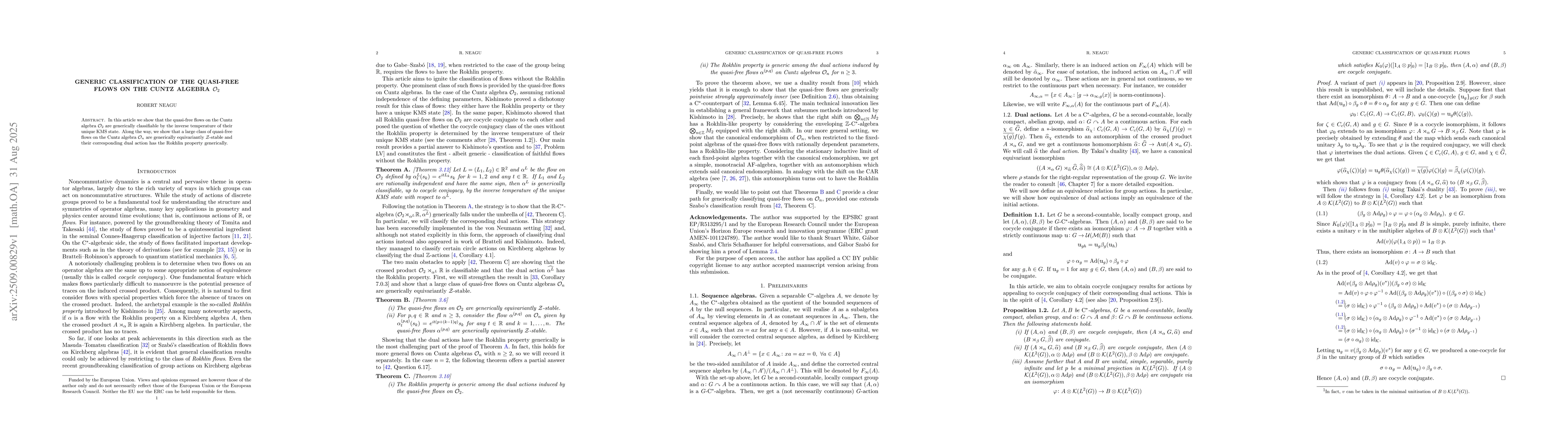 In this article we show that the quasi-free flows on the Cuntz algebra $\mathcal{O}_2$ are generically classifiable by the inverse temperature of their unique KMS state. Along the way, we show that a large class of quasi-free flows on the Cuntz algebra $\mathcal{O}_n$ are generically equivariantly $\mathcal{Z}$-stable and their corresponding dual action has the Rokhlin property generically.