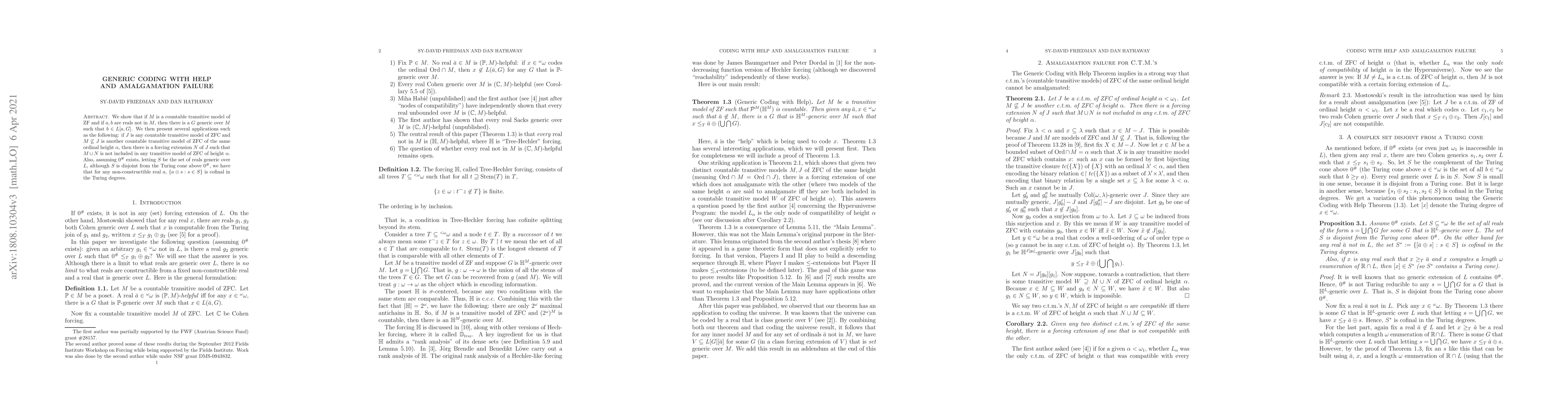 We show that if $M$ is a countable transitive model of ZF and if $a,b$ are reals not in $M$, then there is a $G$ generic over $M$ such that $b \in L[a,G]$. We then present several applications such as the following: if $J$ is any countable transitive model of ZFC and $M \not\subseteq J$ is another countable transitive model of ZFC of the same ordinal height $\alpha$, then there is a forcing extension $N$ of $J$ such that $M \cup N$ is not included in any transitive model of ZFC of height $\alpha$. Also, assuming $0^\#$ exists, letting $S$ be the set of reals generic over $L$, although $S$ is disjoint from the Turing cone above $0^\#$, we have that for any non-constructible real $a$, $\{ a \oplus s : s \in S \}$ is cofinal in the Turing degrees.