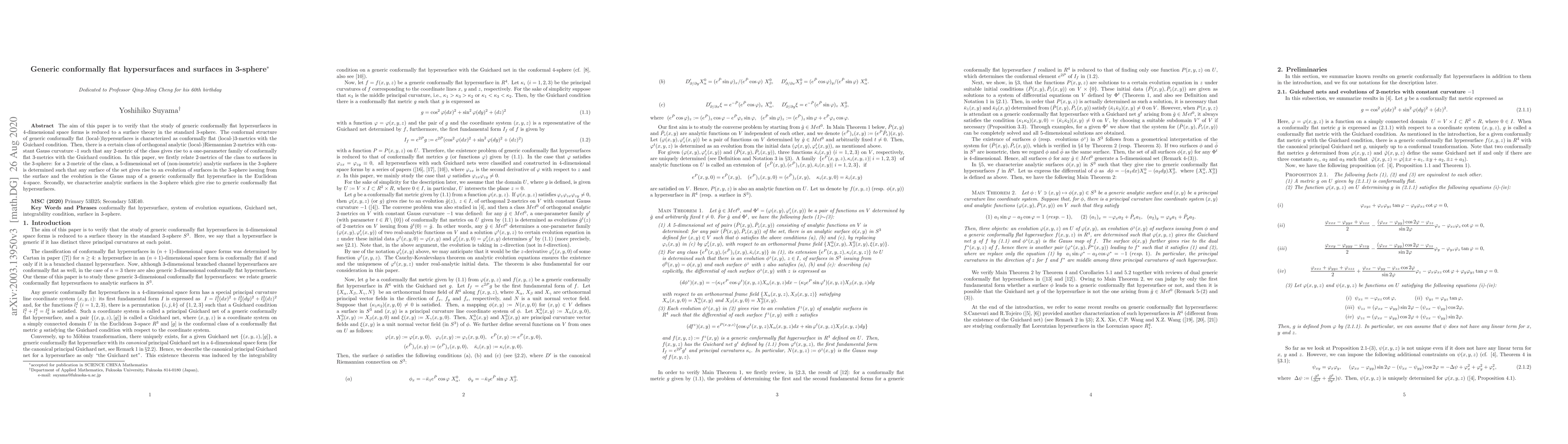 The aim of this paper is to verify that the study of generic conformally flat hypersurfaces in 4-dimensional space forms is reduced to a surface theory in the standard 3-sphere. The conformal structure of generic conformally flat (local-)hypersurfaces is characterized as conformally flat (local-)3-metrics with the Guichard condition. Then, there is a certain class of orthogonal analytic (local-)Riemannian 2-metrics with constant Gauss curvature -1 such that any 2-metric of the class gives rise to a one-parameter family of conformally flat 3-metrics with the Guichard condition. In this paper, we firstly relate 2-metrics of the class to surfaces in the 3-sphere: for a 2-metric of the class, a 5-dimensional set of (non-isometric) analytic surfaces in the 3-sphere is determined such that any surface of the set gives rise to an evolution of surfaces in the 3-sphere issuing from the surface and the evolution is the Gauss map of a generic conformally flat hypersurface in the Euclidean 4-space. Secondly, we characterize analytic surfaces in the 3-sphere which give rise to generic conformally flat hypersurfaces.