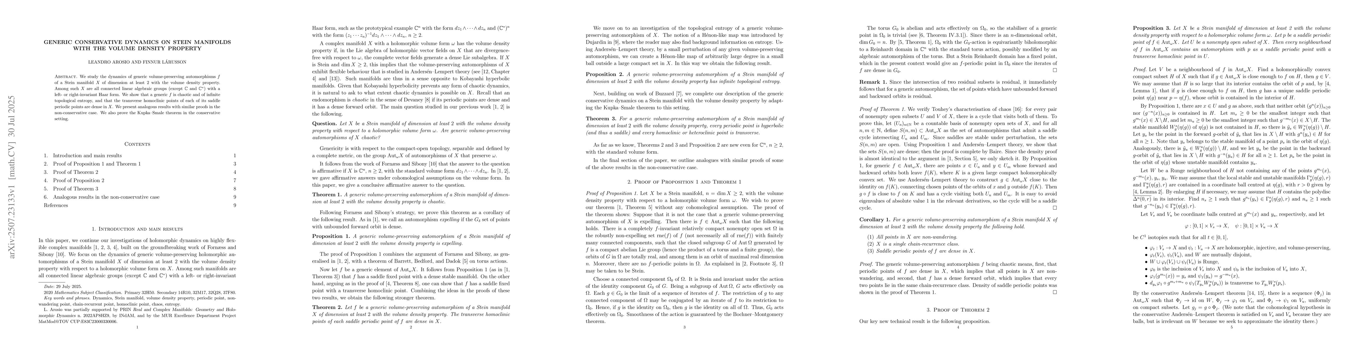 We study the dynamics of generic volume-preserving automorphisms $f$ of a Stein manifold $X$ of dimension at least 2 with the volume density property. Among such $X$ are all connected linear algebraic groups (except $\mathbb{C}$ and $\mathbb{C}^*$) with a left- or right-invariant Haar form. We show that a generic $f$ is chaotic and of infinite topological entropy, and that the transverse homoclinic points of each of its saddle periodic points are dense in $X$. We present analogous results with similar proofs in the non-conservative case. We also prove the Kupka-Smale theorem in the conservative setting.