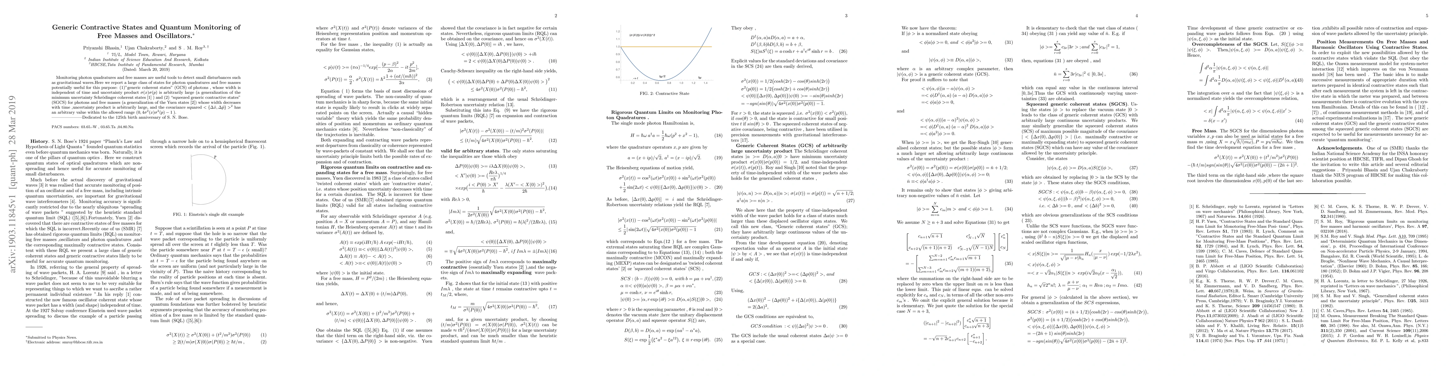 Monitoring photon quadratures and free masses are useful tools to detect small disturbances such as gravitational waves.Here we report a large class of states for photon quadratures and free masses potentially useful for this purpose: (1)'generic coherent states' (GCS) of photons, whose width is independent of time and uncertainty product $\sigma (x) \sigma (p) $ is arbitrarily large (a generalization of the minimum uncertainty Schr\"odinger coherent states and (2) `squeezed generic contractive states' (SGCS) for photons and free masses (a generalization of the Yuen states \cite{Yuen}) whose width decreases with time ,uncertainty product is arbitrarily large, and the covariance squared $ <\{\Delta \hat{x}, \Delta \hat{p} \}>^2 $ has an arbitrary value within the allowed range $(0,4 \sigma ^2 (x) \sigma ^2 (p) -1\>)$. Dedicated to the 125th birth anniversary of S. N. Bose.