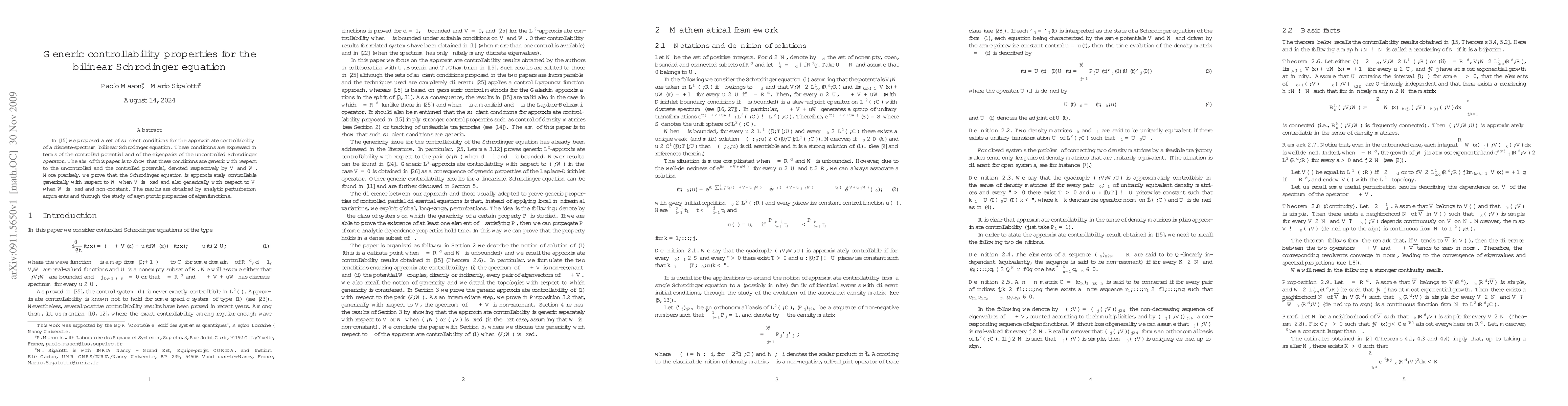 This paper establishes that the sufficient conditions for the approximate controllability of a bilinear Schrödinger equation are generic with respect to both the uncontrolled and controlled potentials. The authors demonstrate that the equation is generically controllable when either potential is fixed, using analytic perturbation arguments and analysis of eigenfunction properties.