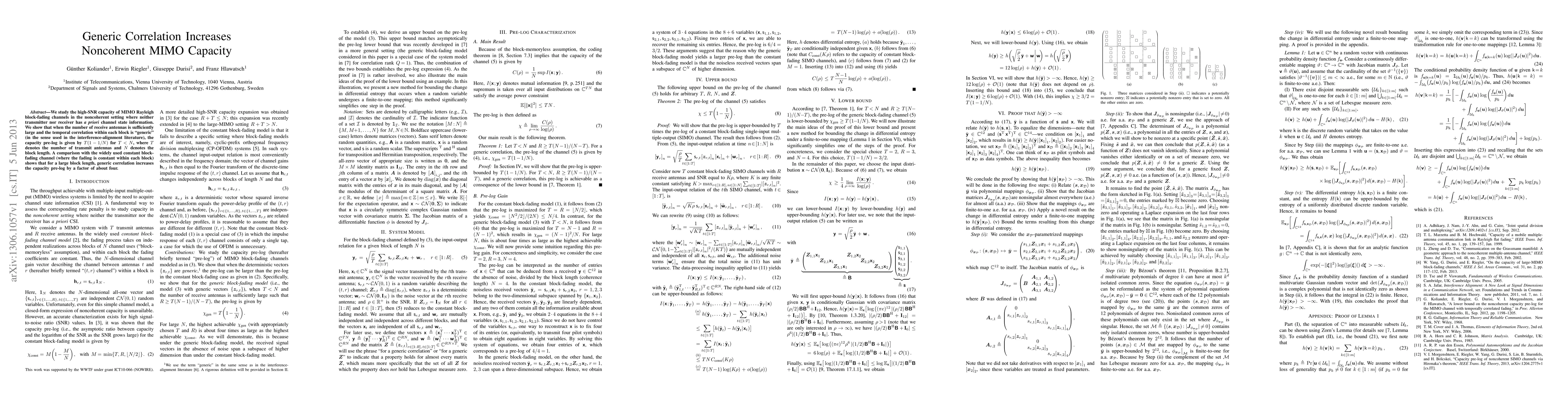 This paper investigates the high-SNR capacity of MIMO Rayleigh block-fading channels without channel state information at the transmitter or receiver. It finds that "generic" temporal correlation among antennas significantly boosts capacity, increasing the pre-log factor by approximately four compared to constant block-fading scenarios.