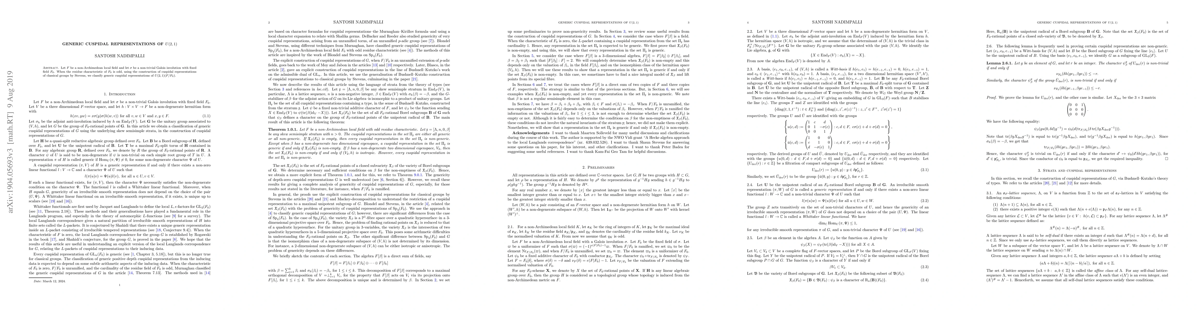 This paper classifies generic cuspidal representations of the unitary group $U(2,1)$ over a non-Archimedean local field $F$ with a Galois involution, using Stevens' explicit construction for classical groups when the residue characteristic of the fixed field is odd.
