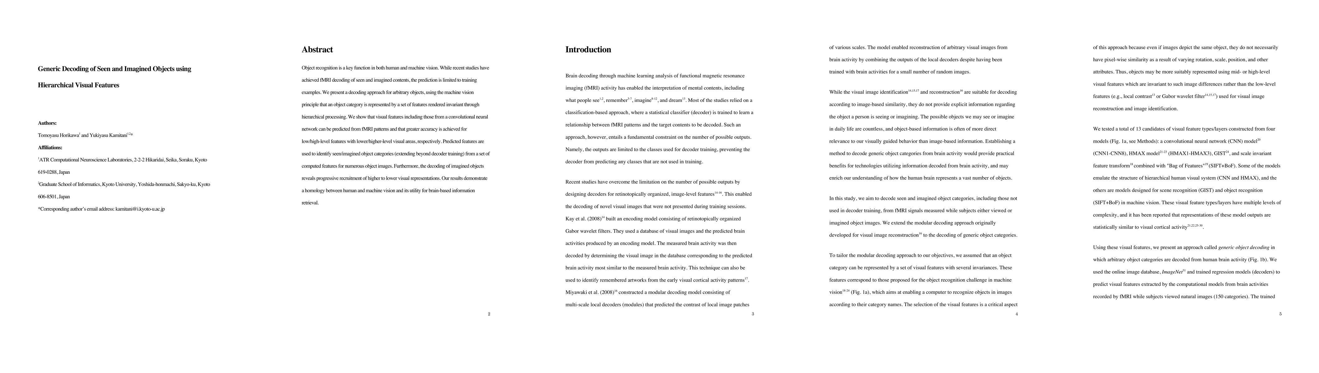This paper presents a decoding method for both seen and imagined objects using fMRI, leveraging hierarchical visual features. It shows that fMRI patterns can predict visual features from a convolutional neural network, with higher accuracy for lower/higher-level features in corresponding visual areas, demonstrating homology between human and machine vision.