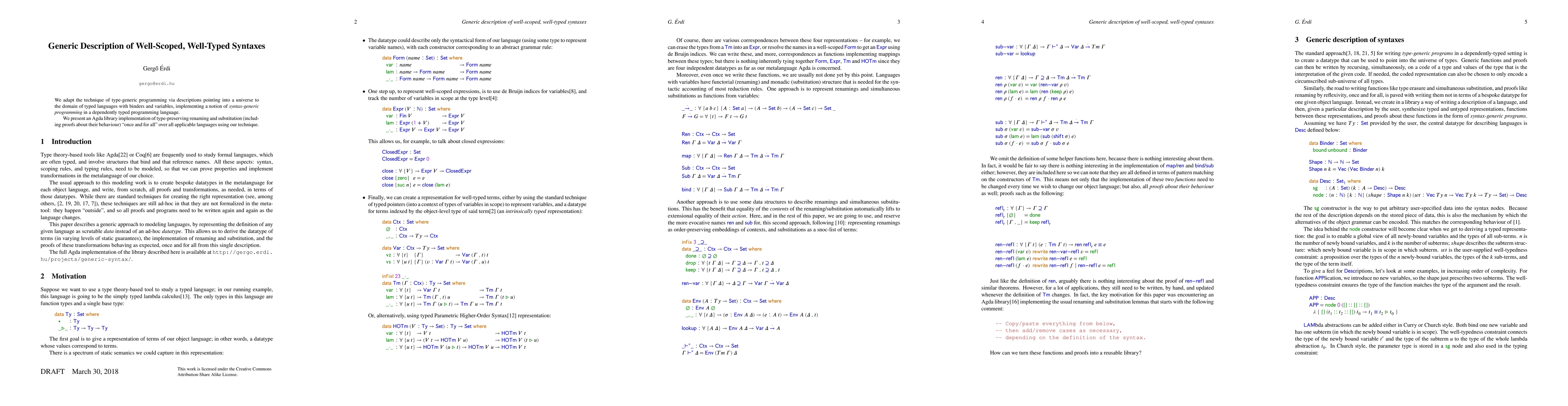 The paper introduces syntax-generic programming in dependently typed languages, presenting an Agda library that implements type-preserving renaming and substitution across all applicable languages with formal proofs of their behavior. This technique leverages type-generic programming to create well-scoped, well-typed syntaxes.