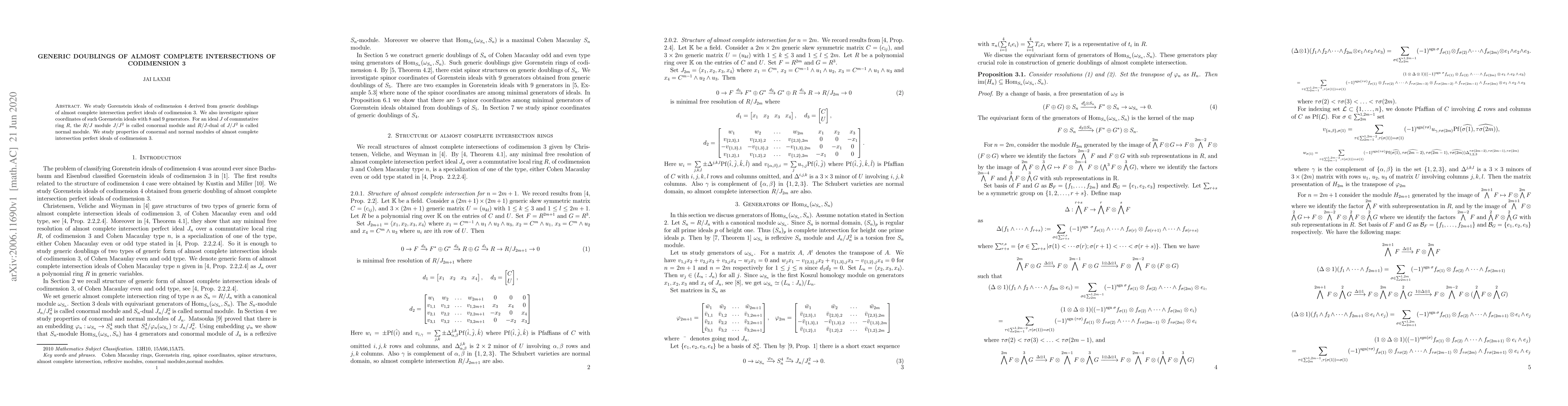 This paper explores Gorenstein ideals of codimension 4 formed through generic doublings of almost complete intersection ideals of codimension 3, and investigates their spinor coordinates with 8 and 9 generators, as well as properties of their conormal and normal modules.