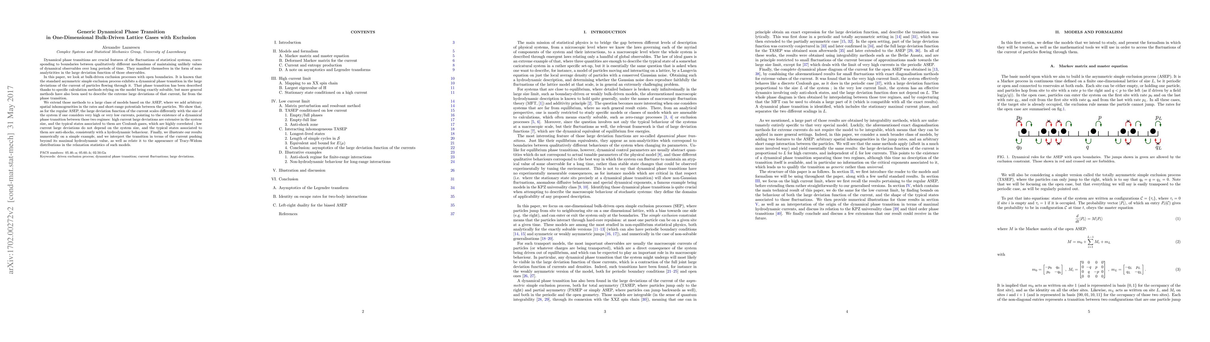 This research identifies a generic dynamical phase transition in one-dimensional bulk-driven lattice gases with exclusion, observed in various models beyond the standard asymmetric simple exclusion process. The study extends methods to describe extreme large deviations of particle current, showing that high current deviations scale extensively with system size and are linked to Coulomb gas states, while low current deviations are system-size independent and associated with anti-shock states. Numerical illustrations and connections to Tracy-Widom distributions in relaxation statistics are also presented.