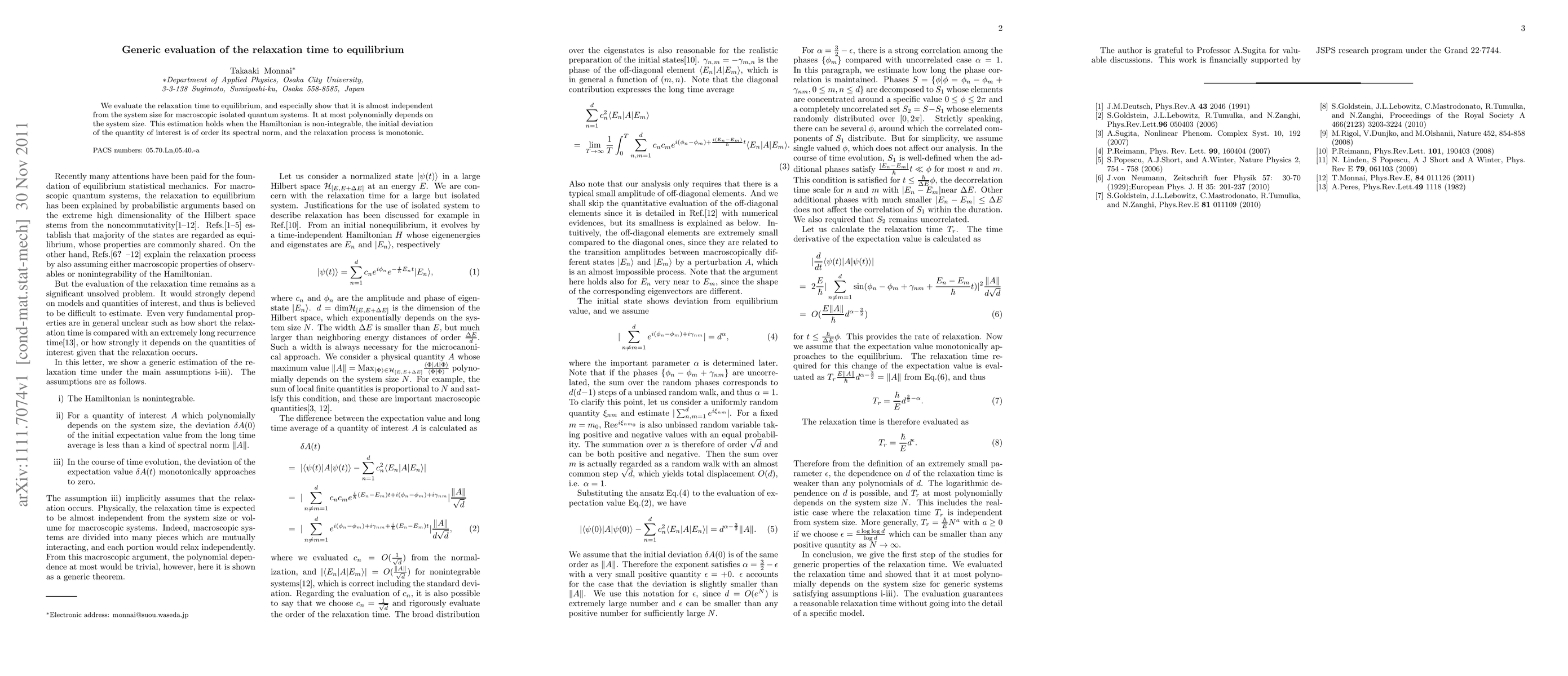 This paper evaluates the relaxation time to equilibrium in macroscopic isolated quantum systems, demonstrating that it is almost independent of system size and at most polynomially dependent, under conditions of non-integrable Hamiltonians and monotonic relaxation processes.