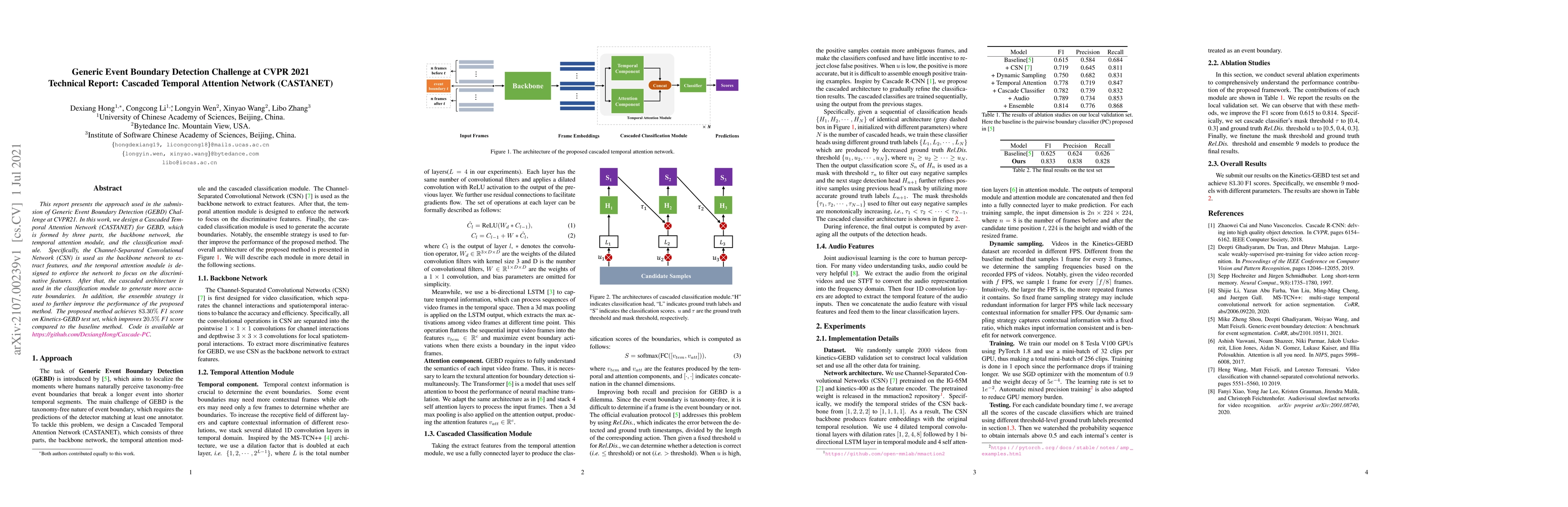 This report details the Cascaded Temporal Attention Network (CASTANET) for the Generic Event Boundary Detection (GEBD) Challenge at CVPR 2021, achieving an 83.30% F1 score and a 20.5% improvement over baseline methods. The method combines a CSN backbone, a temporal attention module, and a cascaded classification module, enhanced by an ensemble strategy.