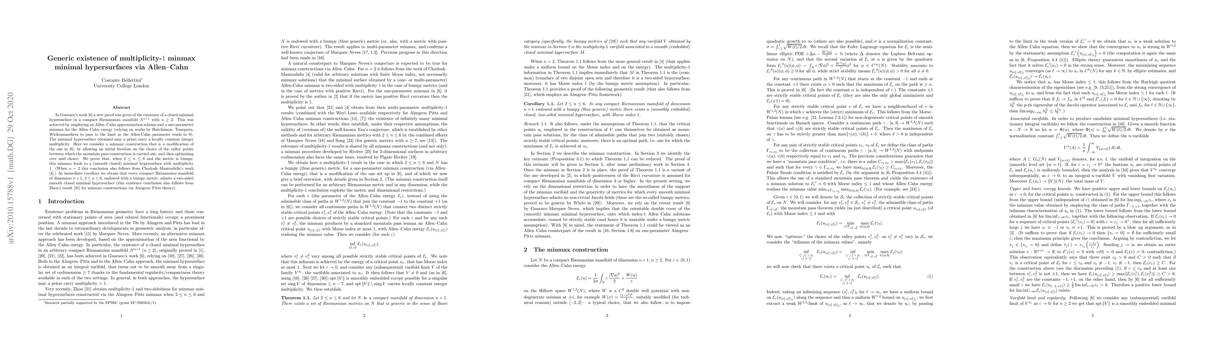 In Guaraco's 2018 work a new proof was given of the existence of a closed minimal hypersurface in a compact Riemannian manifold $N^{n+1}$ with $n\geq 2$. This was achieved by employing an Allen--Cahn approximation scheme and a one-parameter minmax for the Allen--Cahn energy (relying on works by Hutchinson, Tonegawa, Wickramasekera to pass to the limit as the Allen-Cahn parameter tends to $0$). The minimal hypersurface obtained may a priori carry a locally constant integer multiplicity. Here we consider a minmax construction that is a modification of the one in the aforementioned work, by allowing an initial freedom on the choice of the valley points between which the mountain pass construction is carried out, and then optimising over said choice. We prove that, when $2\leq n\leq 6$ and the metric is bumpy, this minmax leads to a (smooth closed) minimal hypersurface with multiplicity $1$. (When $n=2$ this conclusion also follows from Chodosh--Mantoulidis's recent work.) As immediate corollary we obtain that every compact Riemannian manifold of dimension $n+1$, $2\leq n\leq 6$, endowed with a bumpy metric, admits a two-sided smooth closed minimal hypersurface (this existence conclusion also follows from Zhou's recent result for minmax constructions via Almgren--Pitts theory).