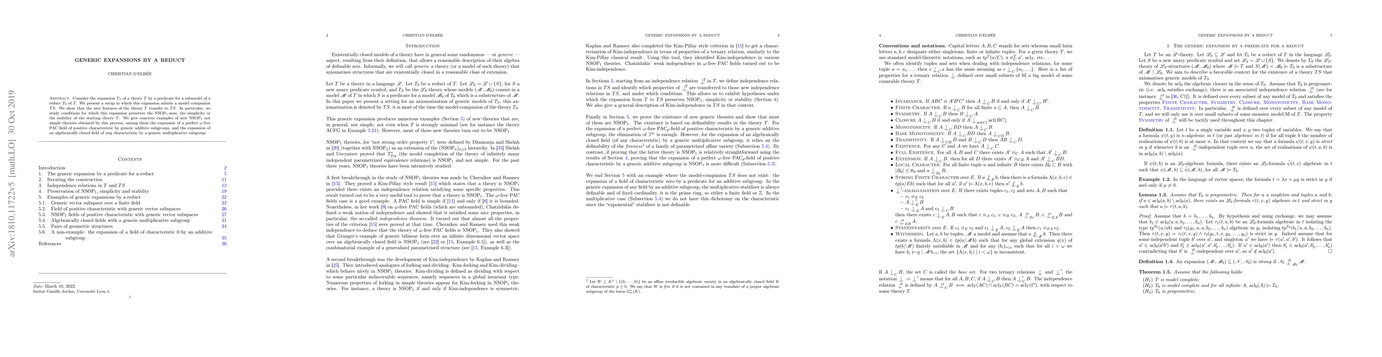 Consider the expansion $T_S$ of a theory $T$ by a predicate for a submodel of a reduct $T_0$ of $T$. We present a setup in which this expansion admits a model companion $TS$. We show that the nice features of the theory $T$ transfer to $TS$. In particular, we study conditions for which this expansion preserves the $\NSOP{1}$-ness, the simplicity or the stability of the starting theory $T$. We give concrete examples of new $\NSOP{1}$ not simple theories obtained by this process, among them the expansion of a perfect $\omega$-free $\PAC$ field of positive characteristic by generic additive subgroups, and the expansion of an algebraically closed field of \emph{any} characteristic by a generic multiplicative subgroup.