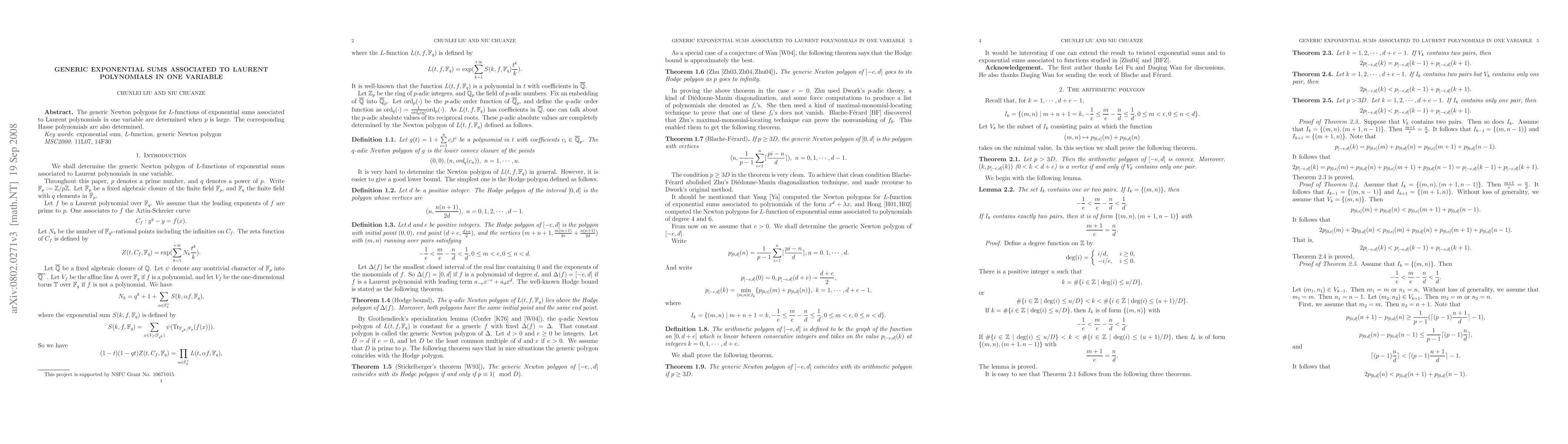 Summary: This paper determines the generic Newton polygons and corresponding Hasse polynomials for L-functions of exponential sums tied to Laurent polynomials in one variable. The findings provide insights into the analytic properties of these sums.