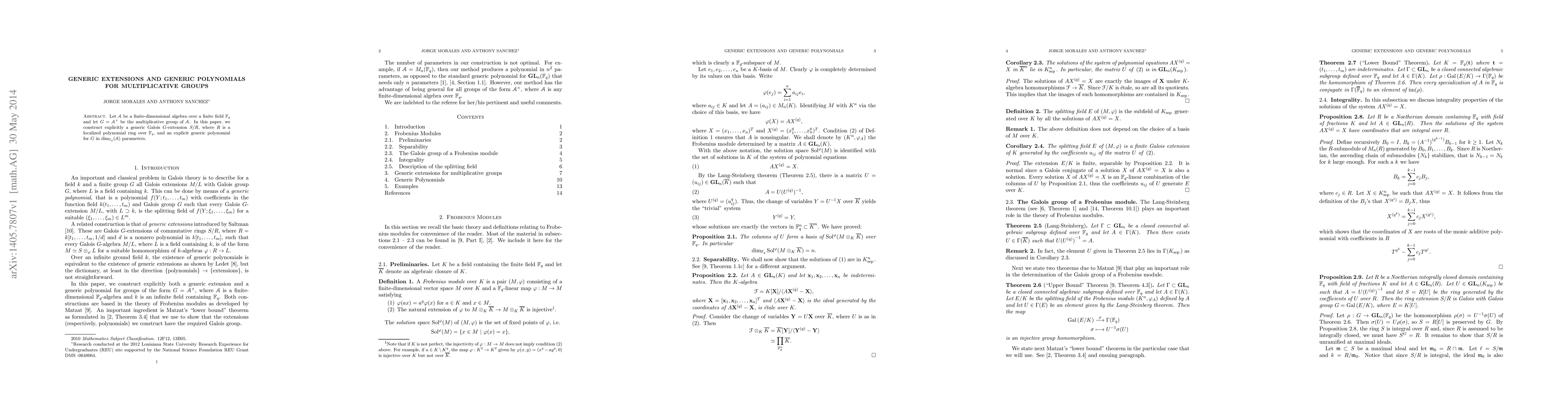 This paper constructs a generic Galois $G$-extension $S/R$ for a finite-dimensional algebra $\mathcal{A}$ over $\mathbf{F}_q$, where $G$ is the multiplicative group of $\mathcal{A}$. It also provides an explicit generic polynomial for $G$ with parameters corresponding to the dimension of $\mathcal{A}$.