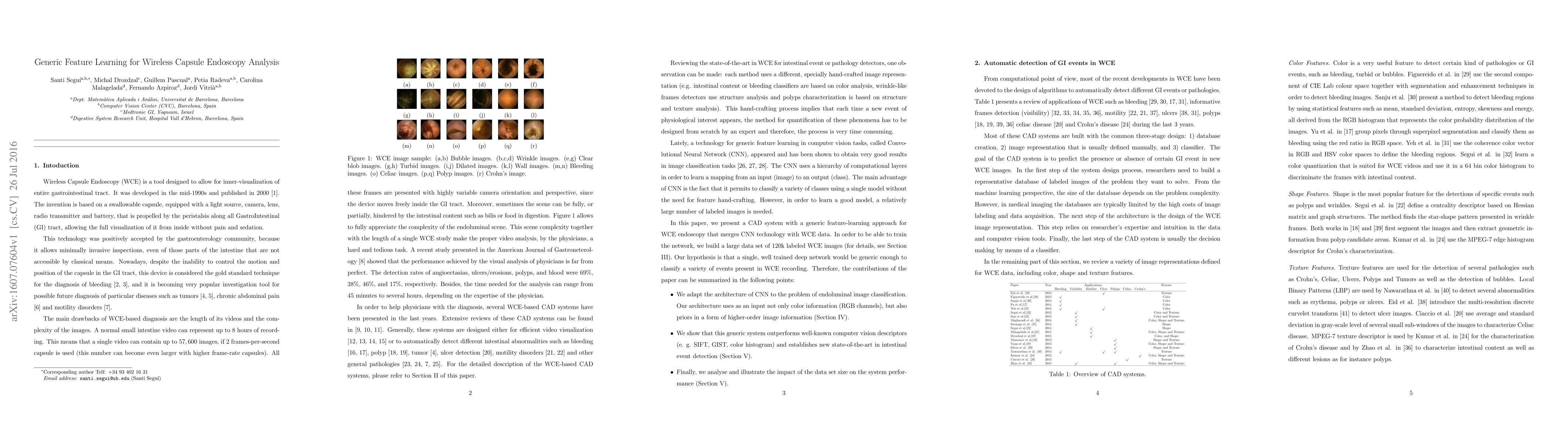This paper proposes a Deep Convolutional Neural Network system for automatic analysis of wireless capsule endoscopy recordings, eliminating the need for manual feature design. The system achieves a 96% mean classification accuracy for six motility events, outperforming traditional hand-crafted feature classifiers by a significant margin.