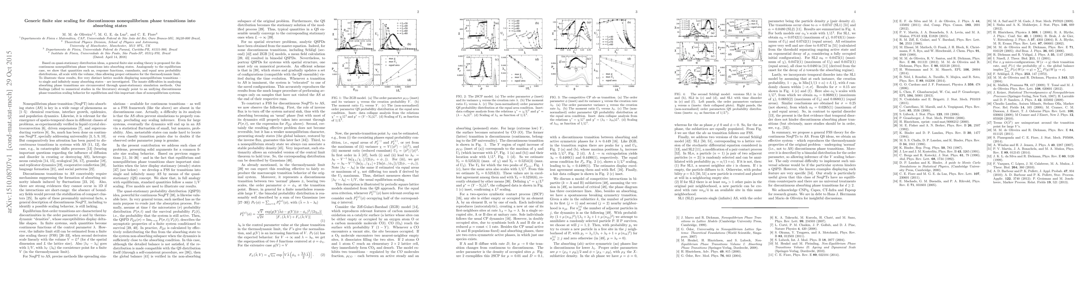 This paper proposes a finite size scaling theory for discontinuous nonequilibrium phase transitions into absorbing states, demonstrating that key quantities scale with the system volume, akin to equilibrium systems. The study uses quasi-stationary distribution ideas and simulation methods to analyze five distinct lattice models, revealing a unifying scaling behavior for both equilibrium and nonequilibrium phase transitions.