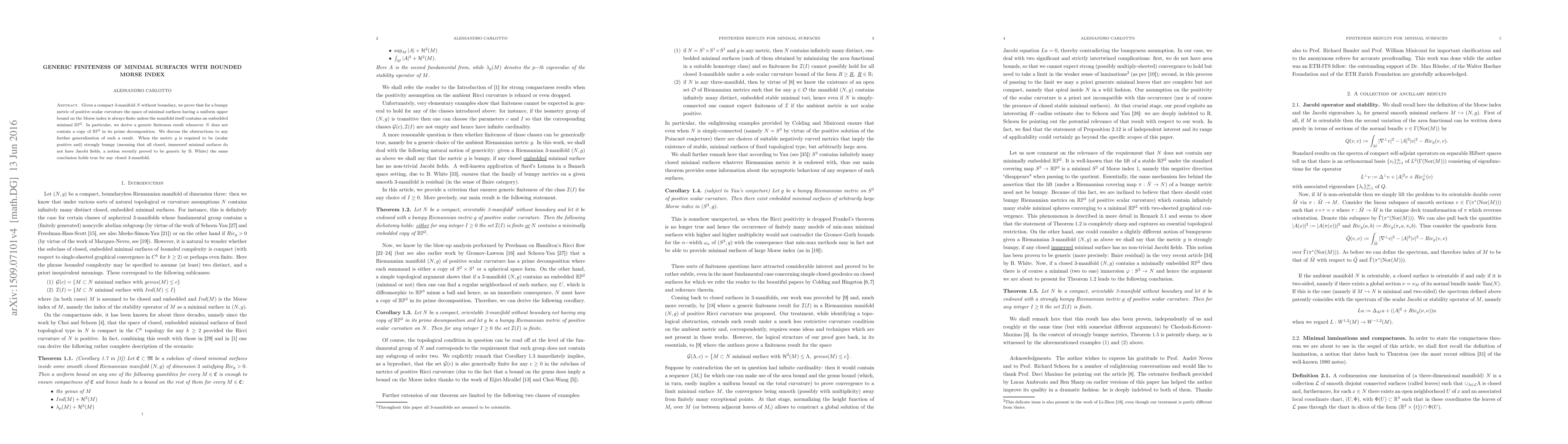 This paper proves that in a compact 3-manifold N without boundary, the space of minimal surfaces with a bounded Morse index is generically finite under a bumpy metric with positive scalar curvature, unless N contains an embedded minimal RP^2. The result holds for any closed 3-manifold under strongly bumpy metrics.