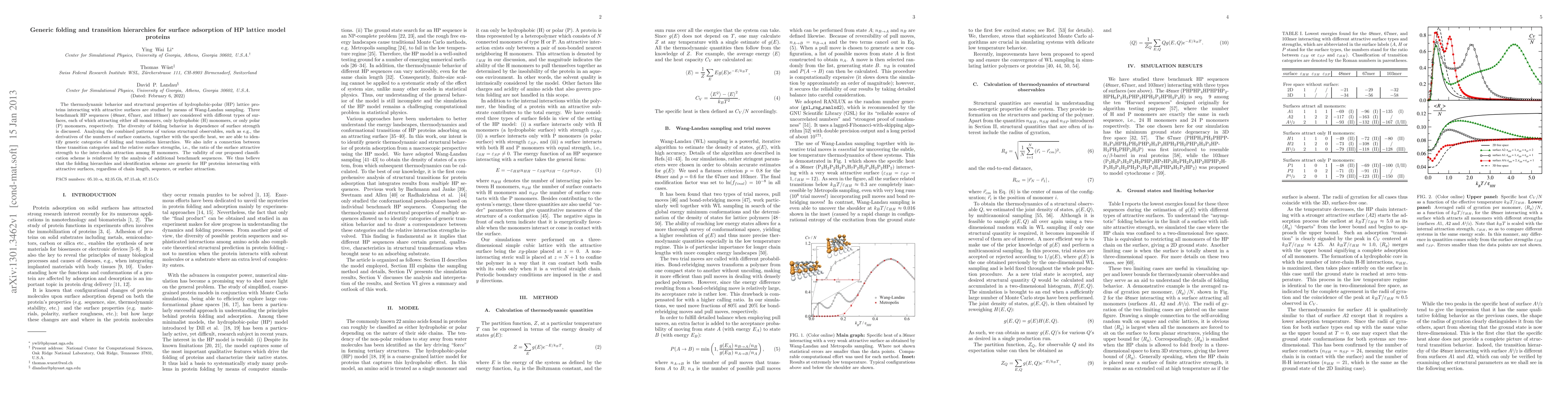 This paper explores the thermodynamic behavior and structural properties of hydrophobic-polar lattice proteins near attractive surfaces using Wang-Landau sampling. It identifies generic folding and transition hierarchies based on surface strength and interchain attraction ratios, validated across various protein sequences and surface types.