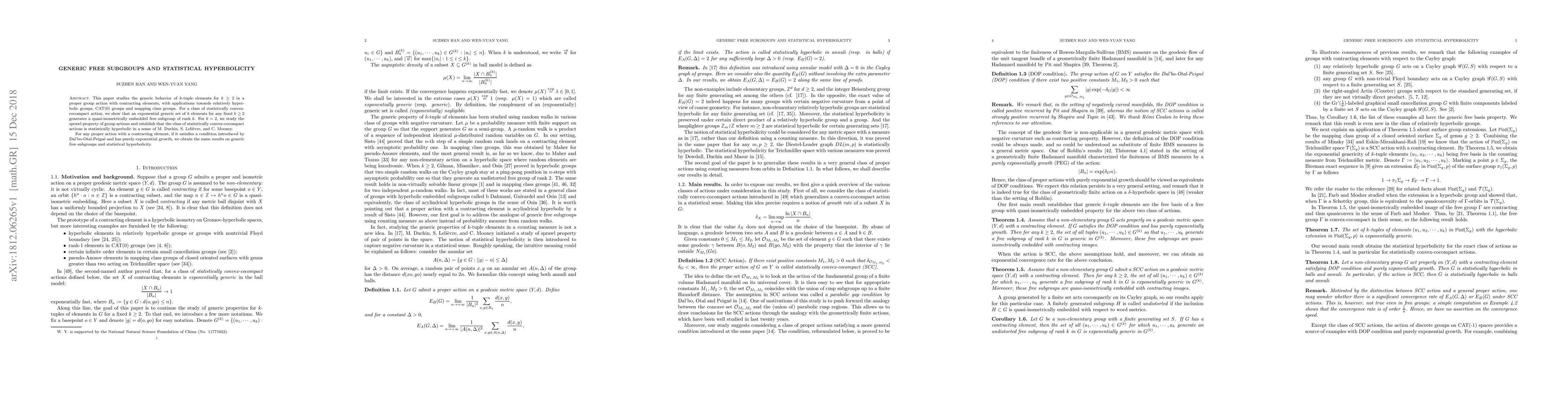 This paper studies the generic behavior of $k$-tuple elements for $k\ge 2$ in a proper group action with contracting elements, with applications towards relatively hyperbolic groups, CAT(0) groups and mapping class groups. For a class of statistically convex-cocompact action, we show that an exponential generic set of $k$ elements for any fixed $k\ge 2$ generates a quasi-isometrically embedded free subgroup of rank $k$. For $k=2$, we study the sprawl property of group actions and establish that the class of statistically convex-cocompact actions is statistically hyperbolic in a sense of M. Duchin, S. Leli\`evre, and C. Mooney. For any proper action with a contracting element, if it satisfies a condition introduced by Dal'bo-Otal-Peign\'e and has purely exponential growth, we obtain the same results on generic free subgroups and statistical hyperbolicity.