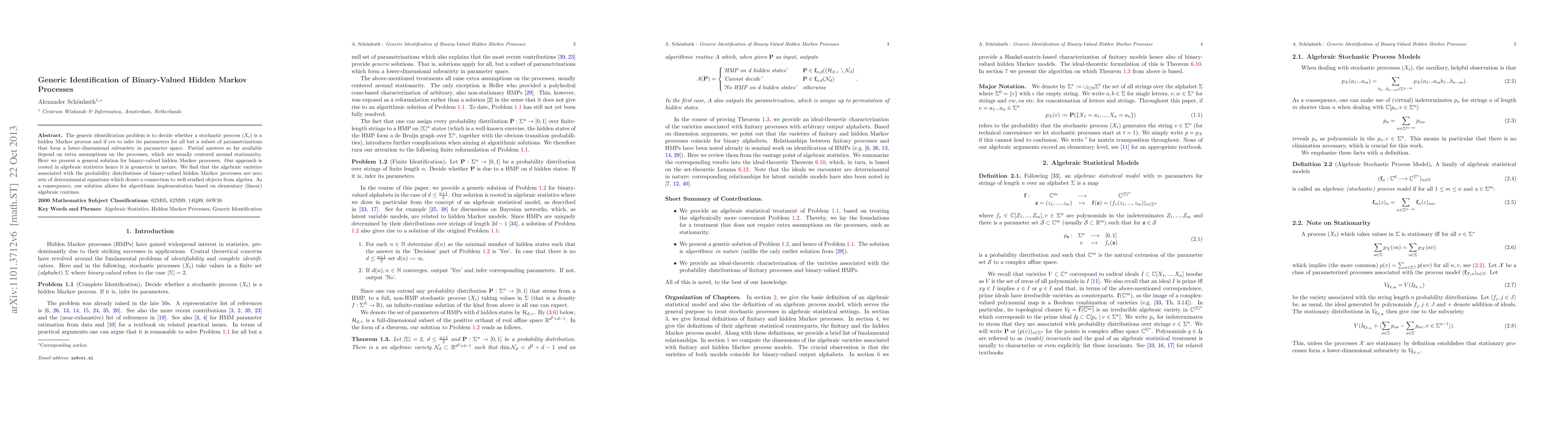 The generic identification problem is to decide whether a stochastic process $(X_t)$ is a hidden Markov process and if yes to infer its parameters for all but a subset of parametrizations that form a lower-dimensional subvariety in parameter space. Partial answers so far available depend on extra assumptions on the processes, which are usually centered around stationarity. Here we present a general solution for binary-valued hidden Markov processes. Our approach is rooted in algebraic statistics hence it is geometric in nature. We find that the algebraic varieties associated with the probability distributions of binary-valued hidden Markov processes are zero sets of determinantal equations which draws a connection to well-studied objects from algebra. As a consequence, our solution allows for algorithmic implementation based on elementary (linear) algebraic routines.
