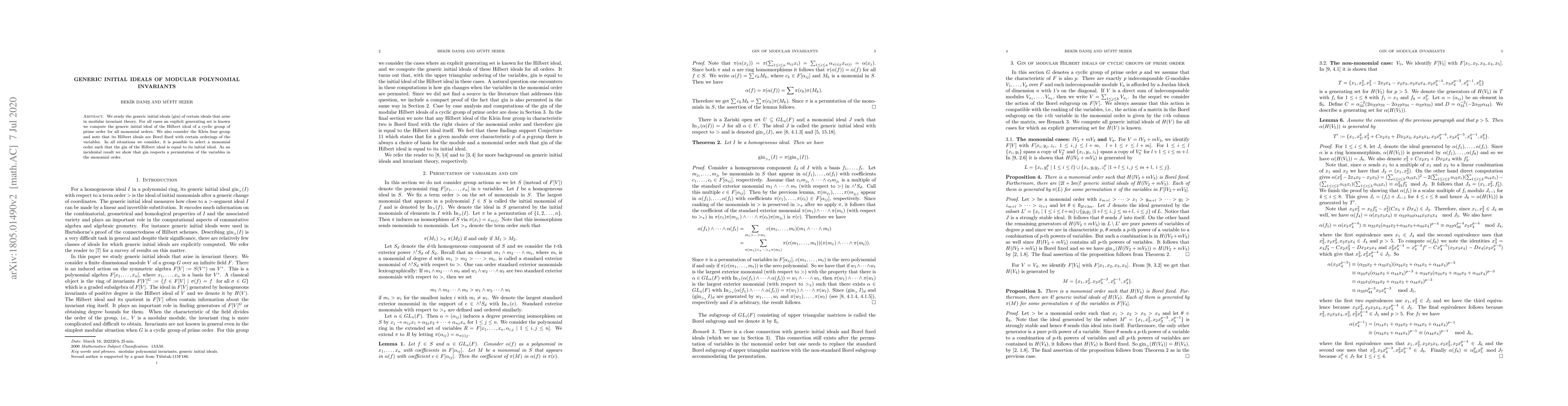 This paper investigates the generic initial ideals (gin) of ideals in modular invariant theory, specifically for cyclic groups of prime order and the Klein four group. It finds that for certain monomial orders, the gin equals the initial ideal, and it demonstrates gin's invariance under variable permutations.