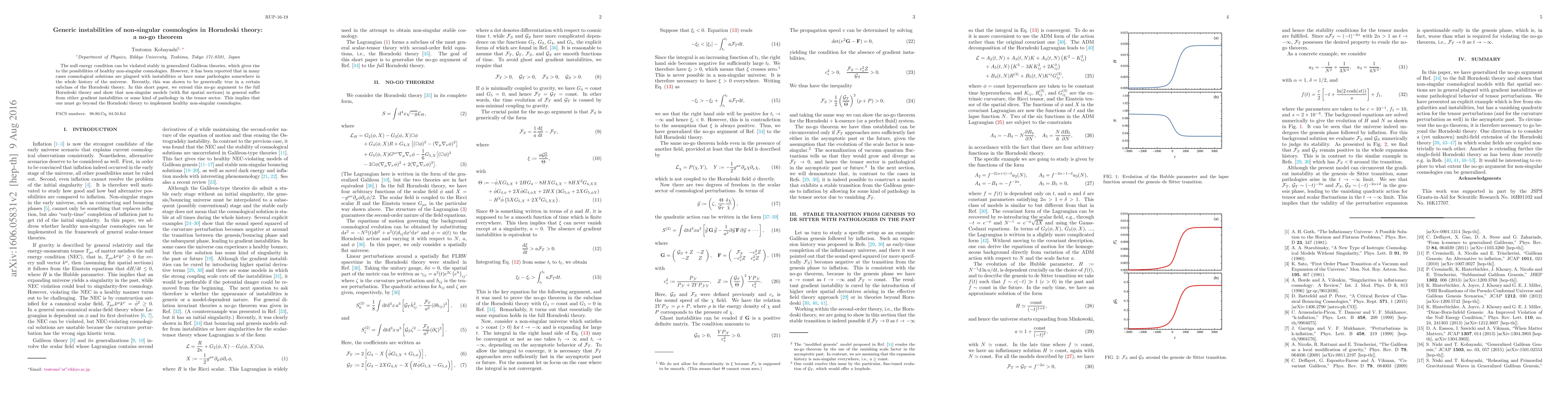 The null energy condition can be violated stably in generalized Galileon theories, which gives rise to the possibilities of healthy non-singular cosmologies. However, it has been reported that in many cases cosmological solutions are plagued with instabilities or have some pathologies somewhere in the whole history of the universe. Recently, this was shown to be generically true in a certain subclass of the Horndeski theory. In this short paper, we extend this no-go argument to the full Horndeski theory, and show that non-singular models (with flat spatial sections) in general suffer either from gradient instabilities or some kind of pathology in the tensor sector. This implies that one must go beyond the Horndeski theory to implement healthy non-singular cosmologies.