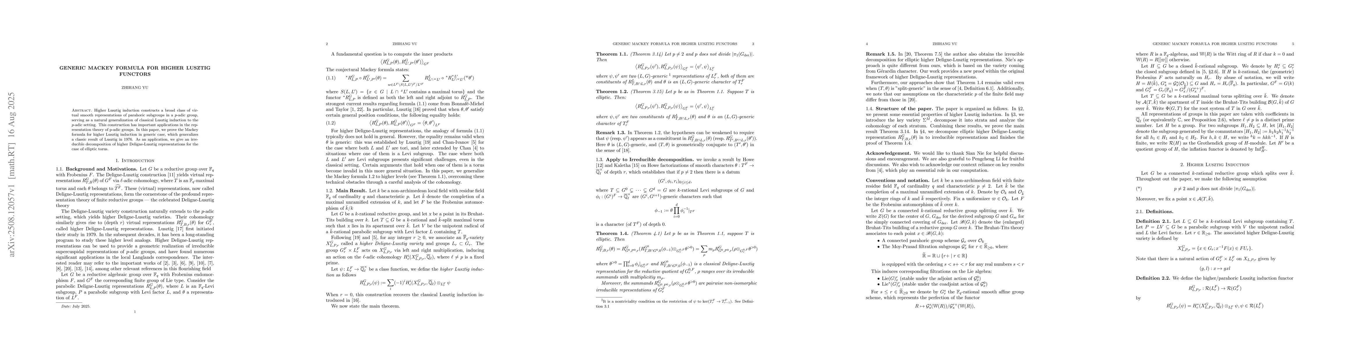 Higher Lusztig induction constructs a broad class of virtual smooth representations of parahoric subgroups in a $p$-adic group, serving as a natural generalization of classical Lusztig induction to the $p$-adic setting. This construction has important applications in the representation theory of p-adic groups. In this paper, we prove the Mackey formula for higher Lusztig induction in generic case, which generalizes a classic result of Lusztig in 1976. As an application, we give an irreducible decomposition of higher Deligne-Lusztig representations for the case of elliptic torus.