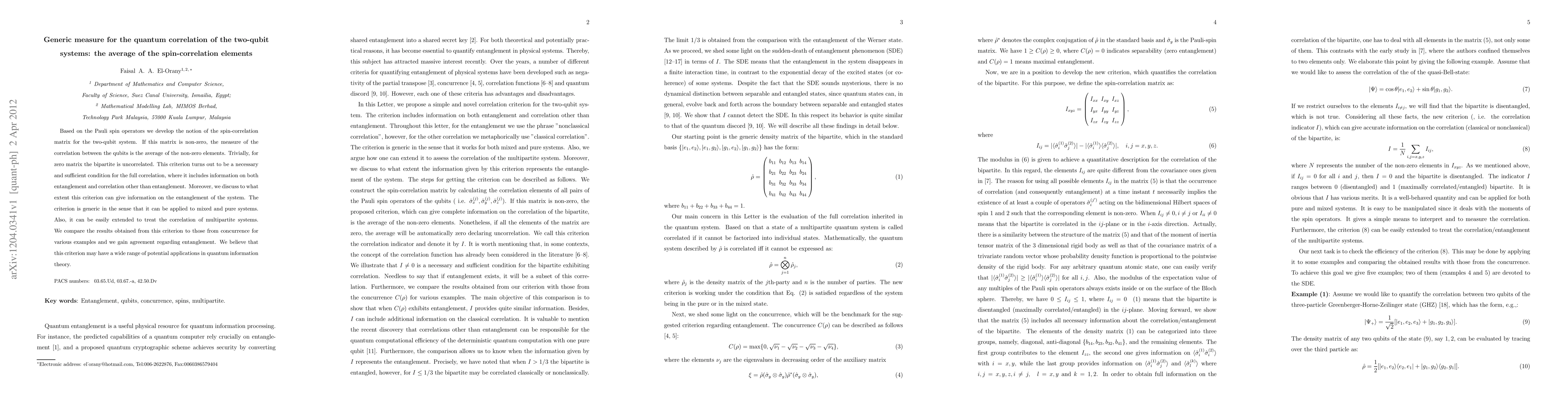Based on the Pauli spin operators we develop the notion of the spin-correlation matrix for the two-qubit system. If this matrix is non-zero, the measure of the correlation between the qubits is the average of the non-zero elements. Trivially, for zero matrix the bipartite is uncorrelated. This criterion turns out to be a necessary and sufficient condition for the full correlation, where it includes information on both entanglement and correlation other than entanglement. Moreover, we discuss to what extent this criterion can give information on the entanglement of the system. The criterion is generic in the sense that it can be applied to mixed and pure systems. Also, it can be easily extended to treat the correlation of multipartite systems. We compare the results obtained from this criterion to those from concurrence for various examples and we gain agreement regarding entanglement. We believe that this criterion may have a wide range of potential applications in quantum information theory.