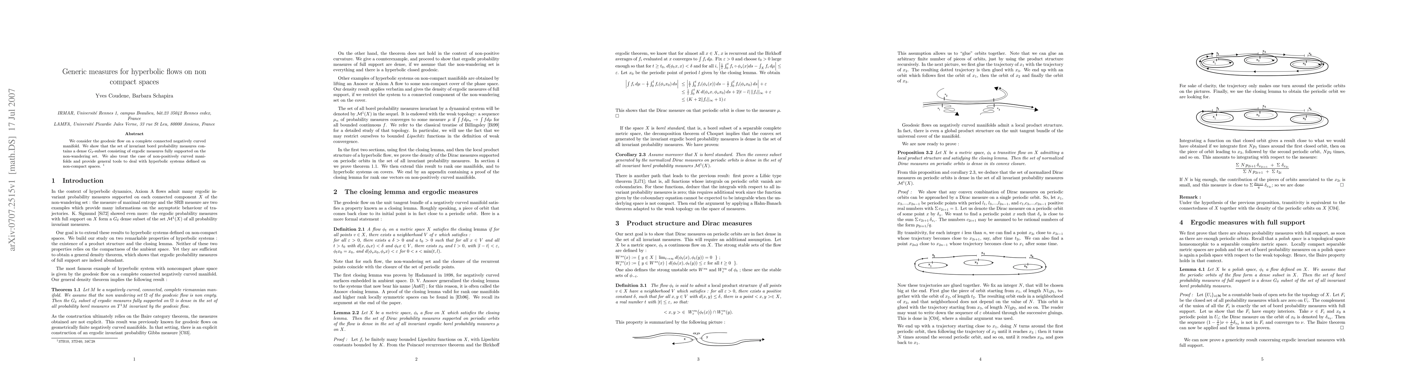 We consider the geodesic flow on a complete connected negatively curved manifold. We show that the set of invariant borel probability measures contains a dense $G_\delta$-subset consisting of ergodic measures fully supported on the non-wandering set. We also trat the case of non-positively curved manifolds and provide general tools to deal with hyperbolic systems defined on non-compact spaces.