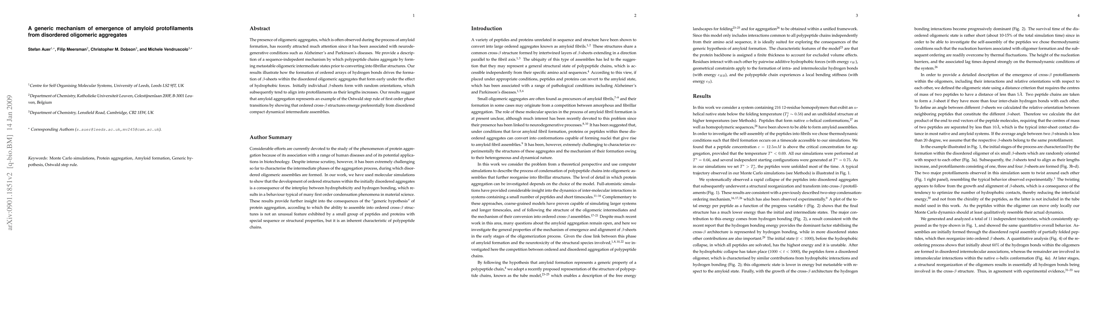 The presence of oligomeric aggregates, which is often observed during the process of amyloid formation, has recently attracted much attention since it has been associated with neurodegenerative conditions such as Alzheimer's and Parkinson's diseases. We provide a description of a sequence-indepedent mechanism by which polypeptide chains aggregate by forming metastable oligomeric intermediate states prior to converting into fibrillar structures. Our results illustrate how the formation of ordered arrays of hydrogen bonds drives the formation of beta-sheets within the disordered oligomeric aggregates that form early under the effect of hydrophobic forces. Initially individual beta-sheets form with random orientations, which subsequently tend to align into protofilaments as their lengths increases. Our results suggest that amyloid aggregation represents an example of the Ostwald step rule of first order phase transitions by showing that ordered cross-beta structures emerge preferentially from disordered compact dynamical intermediate assemblies.