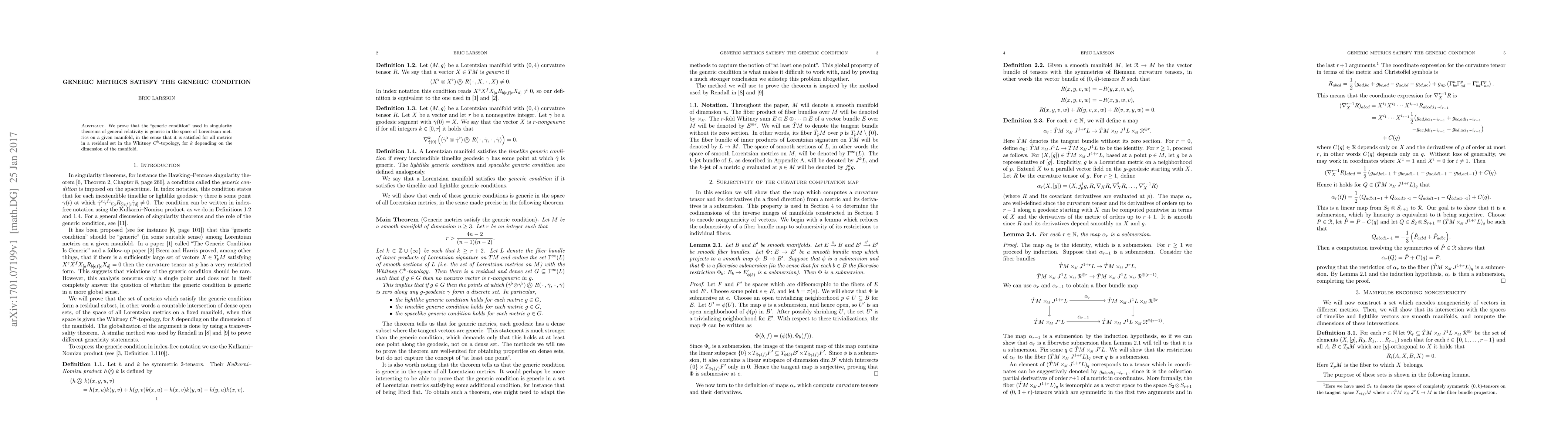 Researchers prove that generic metrics in general relativity satisfy a key condition, known as the generic condition, for most metrics on a given manifold.