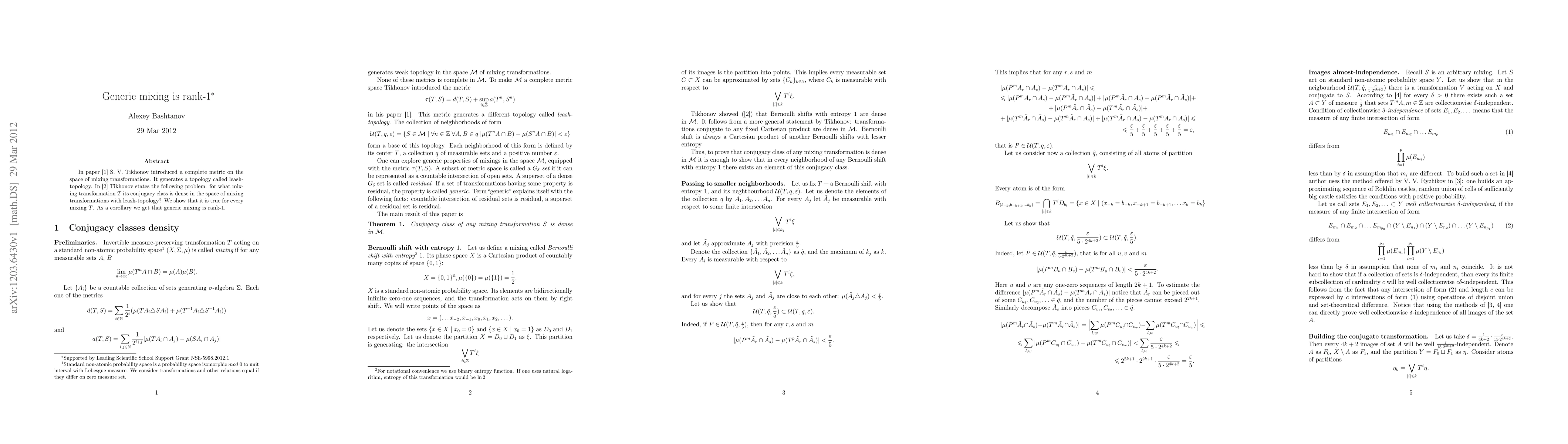 In paper [1] S. V. Tikhonov introduced a complete metric on the space of mixing transformations. It generates a topology called leash-topology. In [2] Tikhonov states the following problem: for what mixing transformation T its conjugacy class is dense in the space of mixing transformations with leash-topology? We show that it is true for every mixing T. As a corollary we get that generic mixing is rank-1.