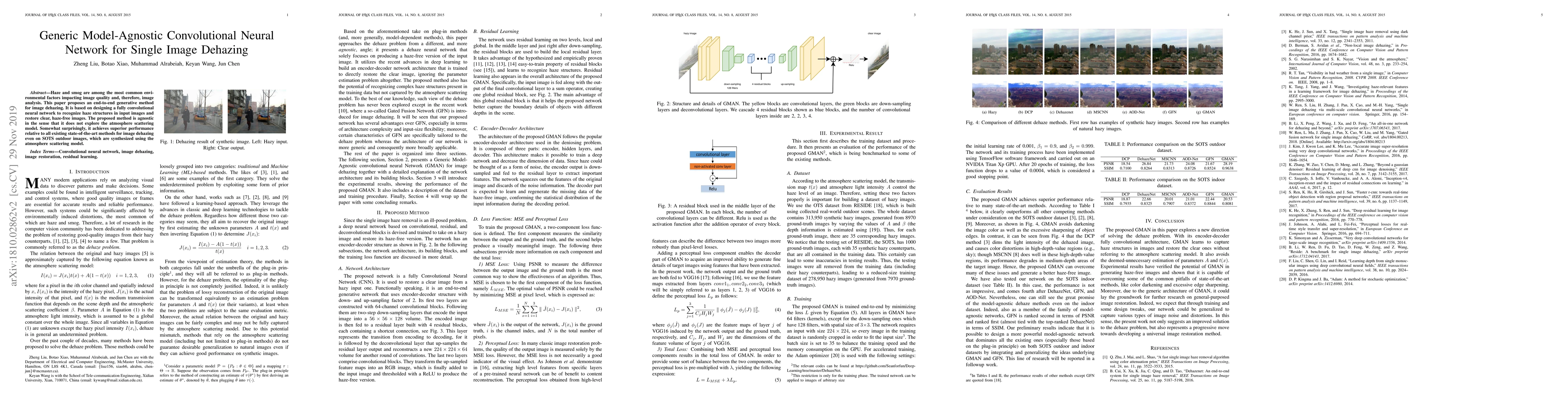 Haze and smog are among the most common environmental factors impacting image quality and, therefore, image analysis. This paper proposes an end-to-end generative method for image dehazing. It is based on designing a fully convolutional neural network to recognize haze structures in input images and restore clear, haze-free images. The proposed method is agnostic in the sense that it does not explore the atmosphere scattering model. Somewhat surprisingly, it achieves superior performance relative to all existing state-of-the-art methods for image dehazing even on SOTS outdoor images, which are synthesized using the atmosphere scattering model. Project detail and code can be found here: https://github.com/Seanforfun/GMAN_Net_Haze_Removal