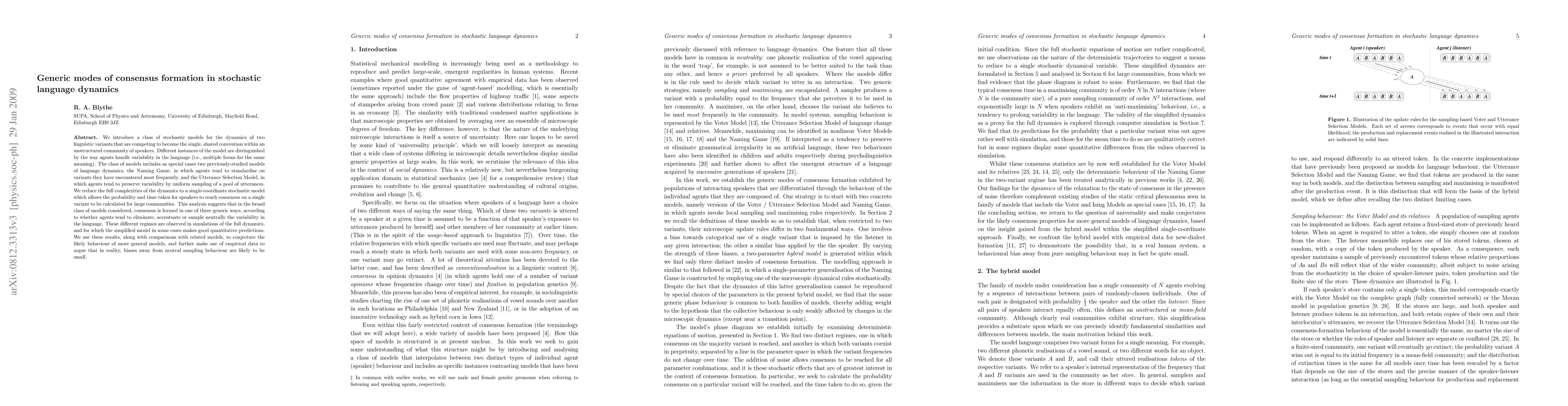 We introduce a class of stochastic models for the dynamics of two linguistic variants that are competing to become the single, shared convention within an unstructured community of speakers. Different instances of the model are distinguished by the way agents handle variability in the language (i.e., multiple forms for the same meaning). The class of models includes as special cases two previously-studied models of language dynamics, the Naming Game, in which agents tend to standardise on variants they have encountered most frequently, and the Utterance Selection Model, in which agents tend to preserve variability by uniform sampling of a pool of utterances. We reduce the full complexities of the dynamics to a single-coordinate stochastic model which allows the probability and time taken for speakers to reach consensus on a single variant to be calculated for large communities. This analysis suggests that in the broad class of models considered, consensus is formed in one of three generic ways, according to whether agents tend to eliminate, accentuate or sample neutrally the variability in the language. These different regimes are observed in simulations of the full dynamics, and for which the simplified model in some cases makes good quantitative predictions. We use these results, along with comparisons with related models, to conjecture the likely behaviour of more general models, and further make use of empirical data to argue that in reality, biases away from neutral sampling behaviour are likely to be small.