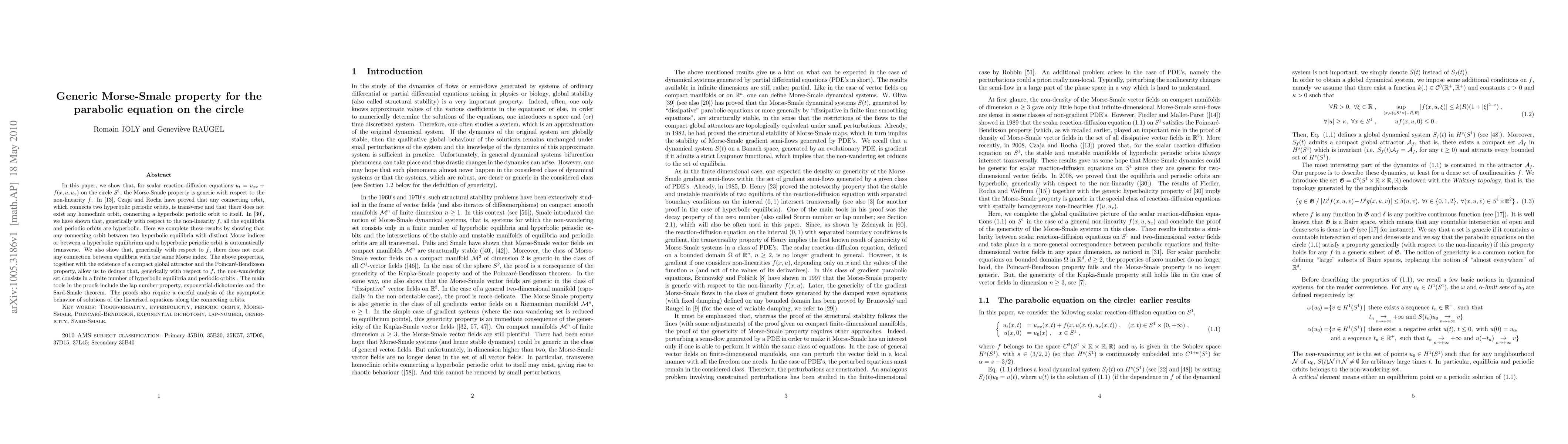 The paper shows that for a specific type of equation on the circle, generic conditions exist where connecting orbits between equilibria or orbits are transverse and do not connect equilibria with the same Morse index, leading to a finite set of hyperbolic equilibria and periodic orbits in the non-wandering set.