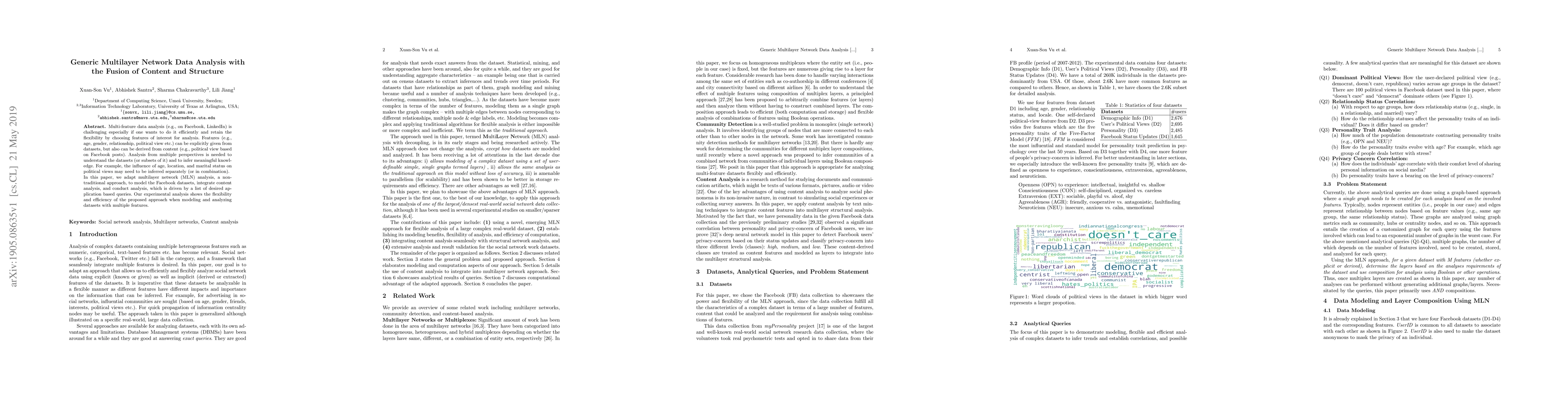 Multi-feature data analysis (e.g., on Facebook, LinkedIn) is challenging especially if one wants to do it efficiently and retain the flexibility by choosing features of interest for analysis. Features (e.g., age, gender, relationship, political view etc.) can be explicitly given from datasets, but also can be derived from content (e.g., political view based on Facebook posts). Analysis from multiple perspectives is needed to understand the datasets (or subsets of it) and to infer meaningful knowledge. For example, the influence of age, location, and marital status on political views may need to be inferred separately (or in combination). In this paper, we adapt multilayer network (MLN) analysis, a nontraditional approach, to model the Facebook datasets, integrate content analysis, and conduct analysis, which is driven by a list of desired application based queries. Our experimental analysis shows the flexibility and efficiency of the proposed approach when modeling and analyzing datasets with multiple features.