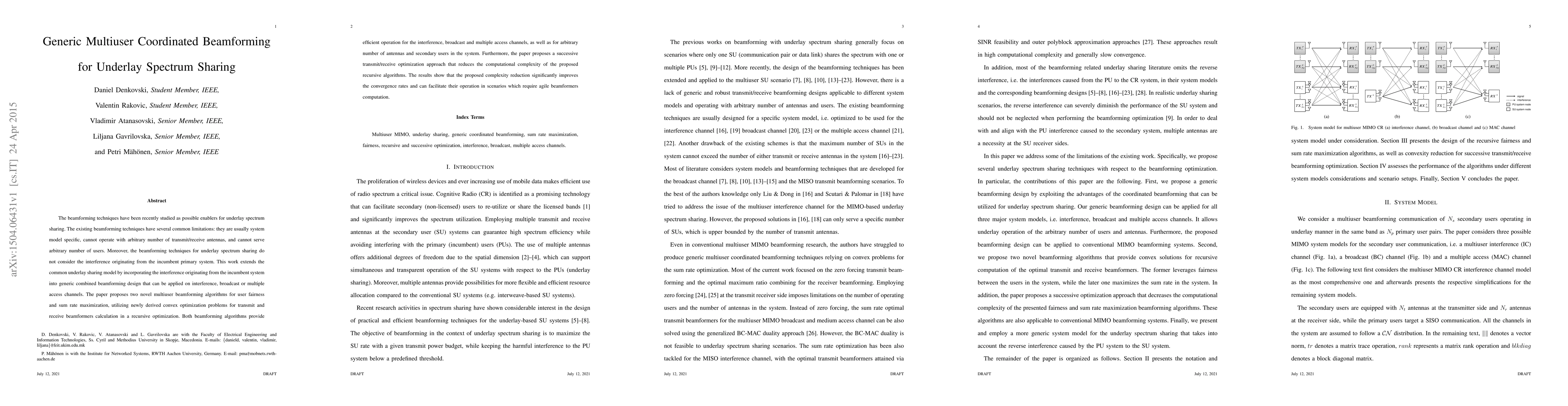 This paper proposes novel multiuser coordinated beamforming algorithms for underlay spectrum sharing, addressing limitations of existing techniques by enabling operation with arbitrary antennas and users. The algorithms maximize user fairness and sum rate, while incorporating interference from primary systems, and utilize a recursive optimization approach with reduced computational complexity.