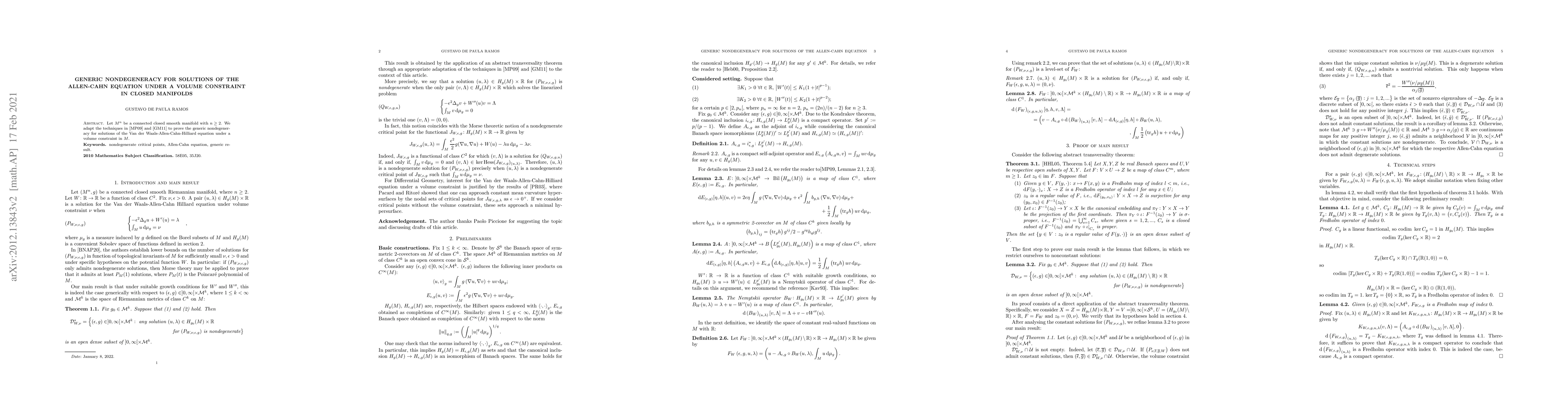 Let $M^n$ be a connected closed smooth manifold, where $n\geq 2$. In this article, we adapt the techniques in Micheletti and Pistoia (2009) and Ghimenti and Micheletti (2011) to prove the generic nondegeneracy for solutions of the Van der Waals-Allen-Cahn-Hilliard equation under a volume constraint in $M$.