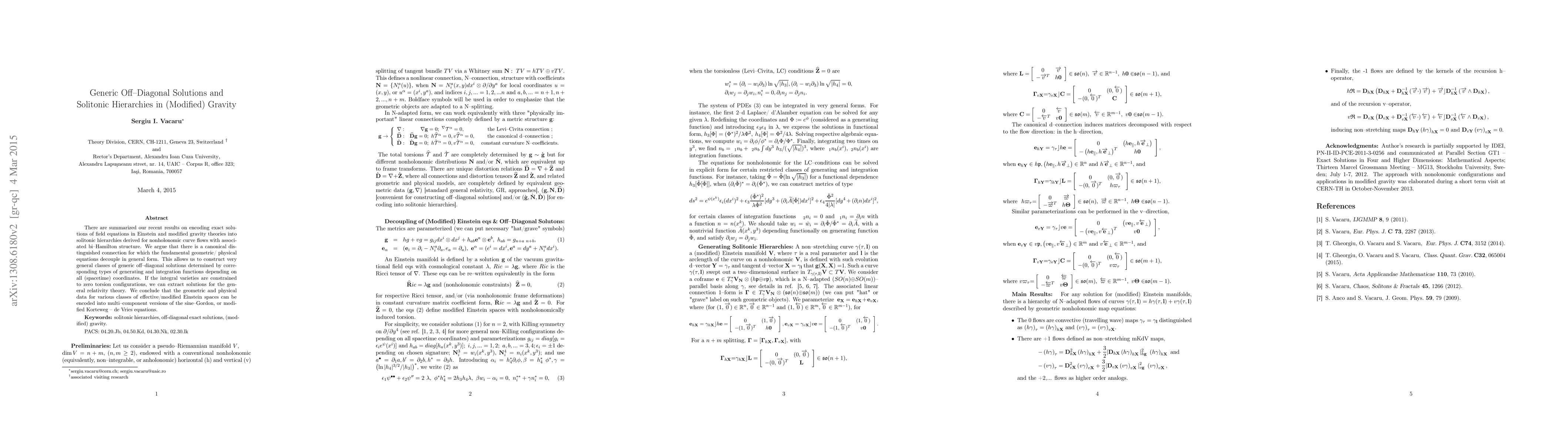 This paper presents a method for encoding exact solutions of Einstein and modified gravity theories into solitonic hierarchies, revealing a decoupling of fundamental equations through a distinguished connection. It constructs generic off-diagonal solutions using generating and integration functions, and identifies solutions for general relativity when torsion configurations are constrained to zero.