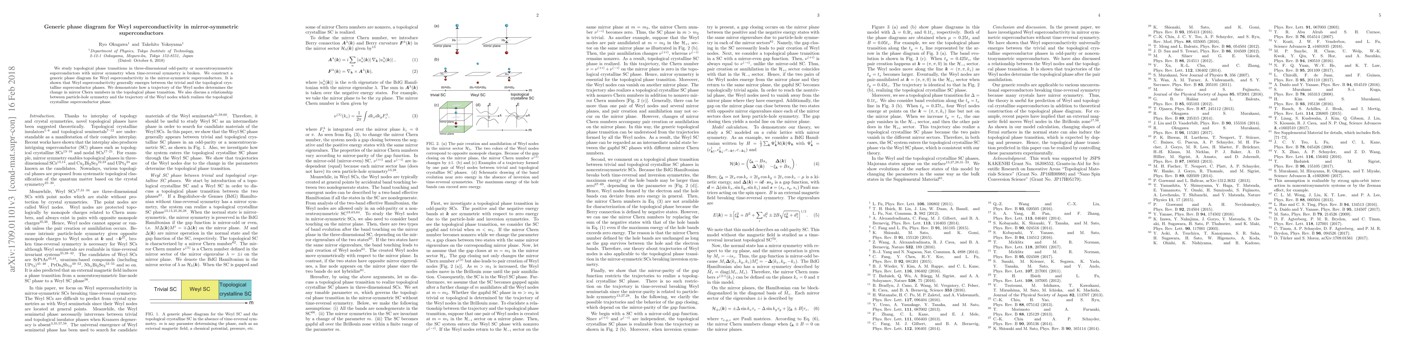 This paper constructs a generic phase diagram for Weyl superconductivity in mirror-symmetric superconductors, showing that Weyl superconductivity occurs between trivial and topological crystalline superconductor phases. It also explores the relationship between the trajectory of Weyl nodes and changes in mirror Chern numbers during topological phase transitions.