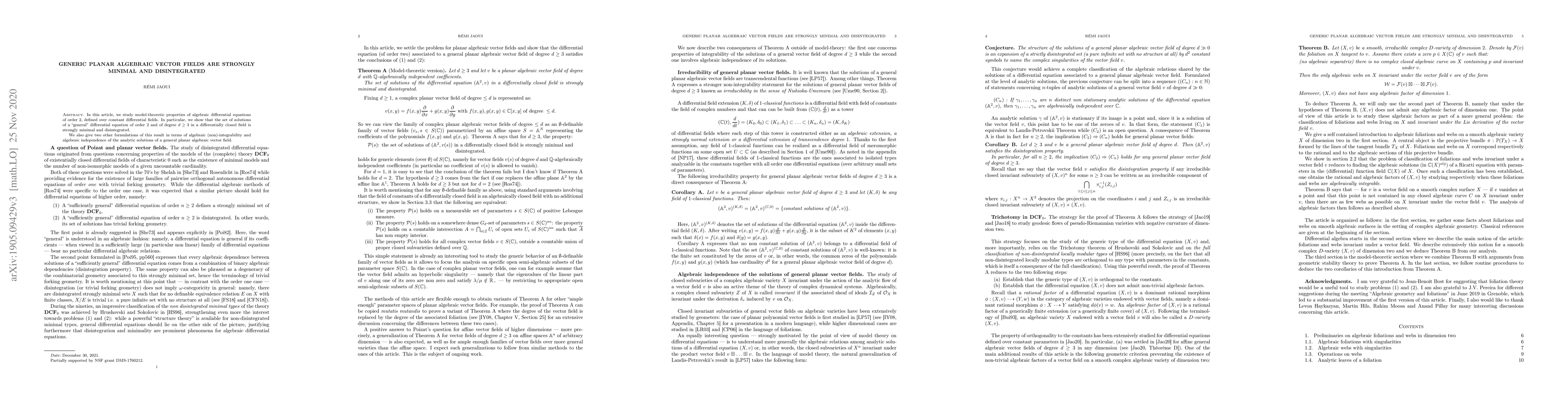 In this article, we study model-theoretic properties of algebraic differential equations of order $2$, defined over constant differential fields. In particular, we show that the set of solutions of a general differential equation of order $2$ and of degree $d \geq 3$ in a differentially closed field is strongly minimal and disintegrated. We also give two other formulations of this result in terms of algebraic (non)-integrability and algebraic independence of the analytic solutions of a general planar algebraic vector field.