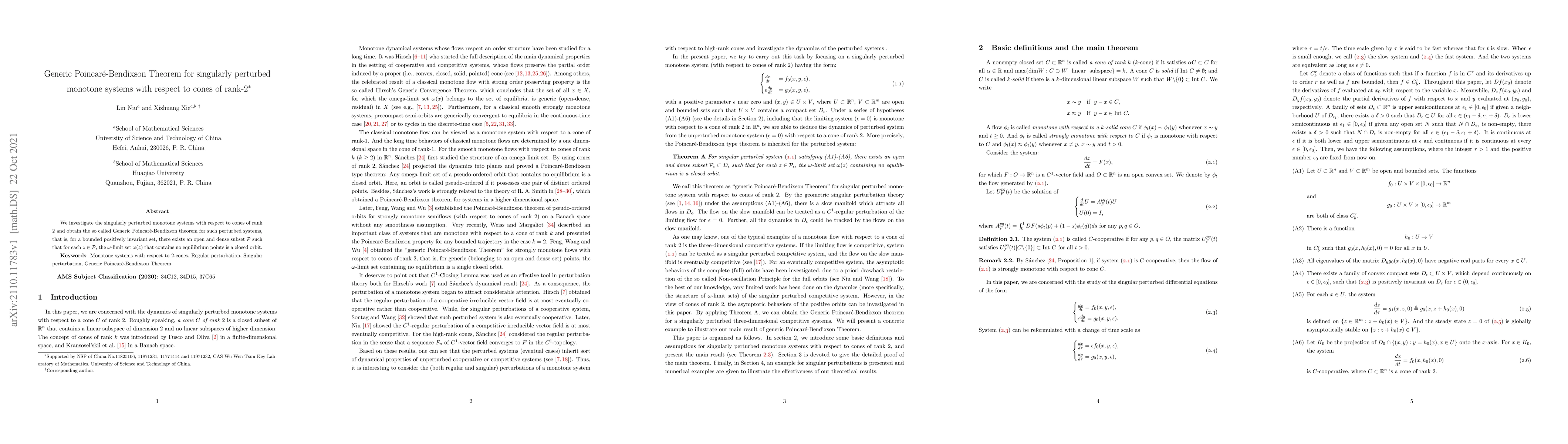 We investigate the singularly perturbed monotone systems with respect to cones of rank $2$ and obtain the so called Generic Poincar\'{e}-Bendixson theorem for such perturbed systems, that is, for a bounded positively invariant set, there exists an open and dense subset $\mathcal{P}$ such that for each $z\in \mathcal{P}$, the $\omega$-limit set $\omega(z)$ that contains no equilibrium points is a closed orbit.