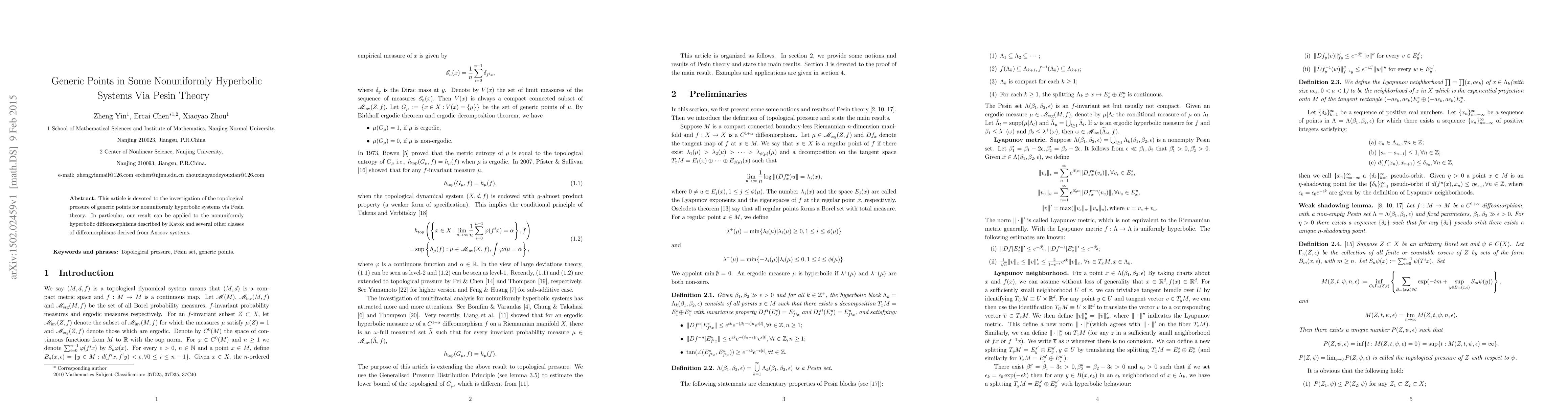 This paper examines the topological pressure of generic points in nonuniformly hyperbolic systems through Pesin theory, with applications to nonuniformly hyperbolic diffeomorphisms described by Katok and other classes derived from Anosov systems. The study leverages Pesin theory to analyze these systems' properties.