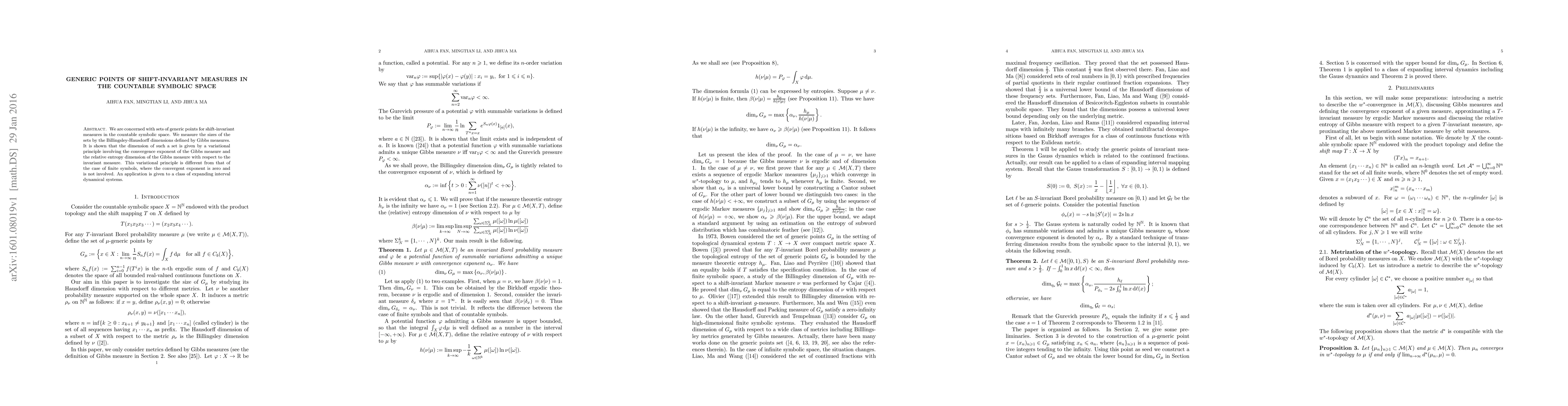 This paper investigates the sets of generic points for shift-invariant measures in countable symbolic spaces, determining their sizes via Billingsley-Hausdorff dimensions defined by Gibbs measures. It reveals a variational principle linking the dimension to the convergence exponent and relative entropy dimension, differing from the finite symbol case. An application is demonstrated for expanding interval dynamical systems.