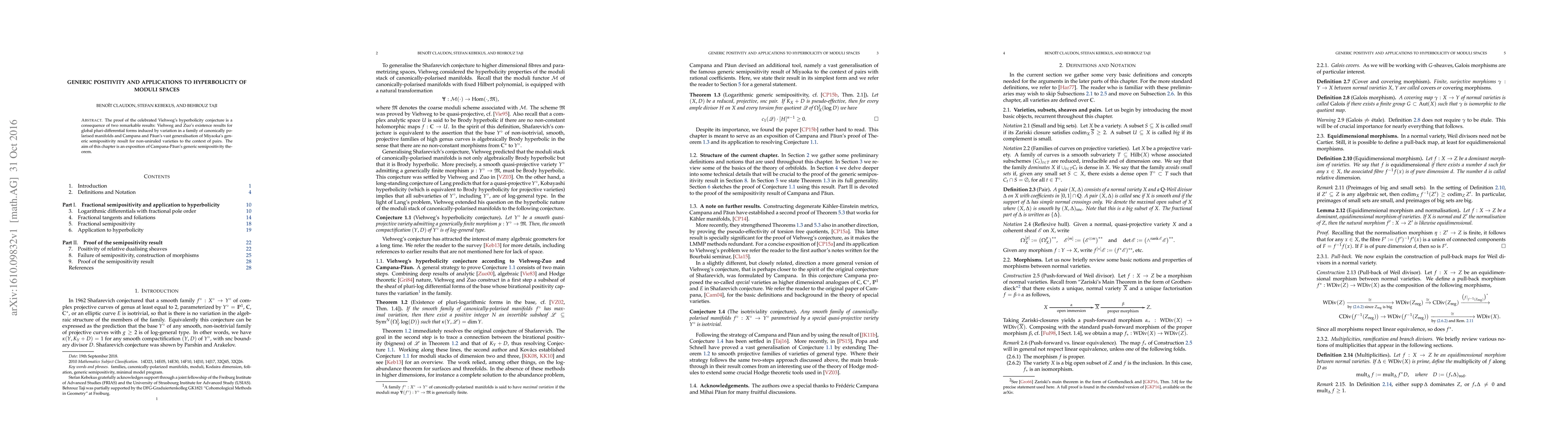 The proof of the celebrated Viehweg's hyperbolicity conjecture is a consequence of two remarkable results: Viehweg and Zuo's existence results for global pluri-differential forms induced by variation in a family of canonically po-larised manifolds and Campana and P\v{a}un's vast generalisation of Miyaoka's generic semipositivity result for non-uniruled varieties to the context of pairs. The aim of this chapter is an exposition of Campana-P\v{a}un's generic semipositivity theorem .