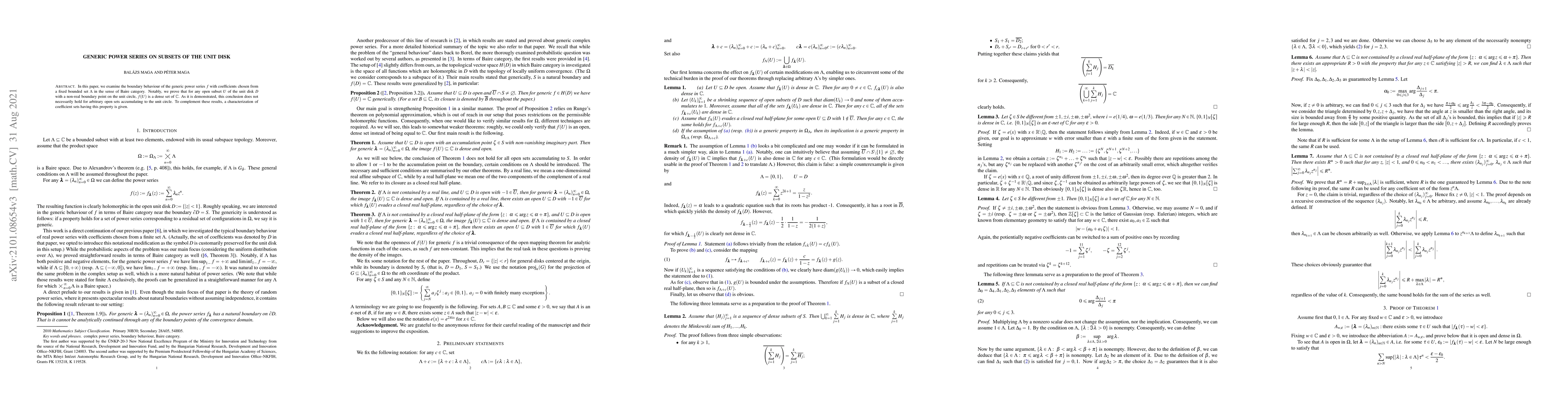 This paper investigates the boundary behavior of generic power series with coefficients from a fixed bounded set, proving that for open subsets of the unit disk with non-real boundary points, the function values are dense in the complex plane. It also provides a characterization of coefficient sets that exhibit this property.