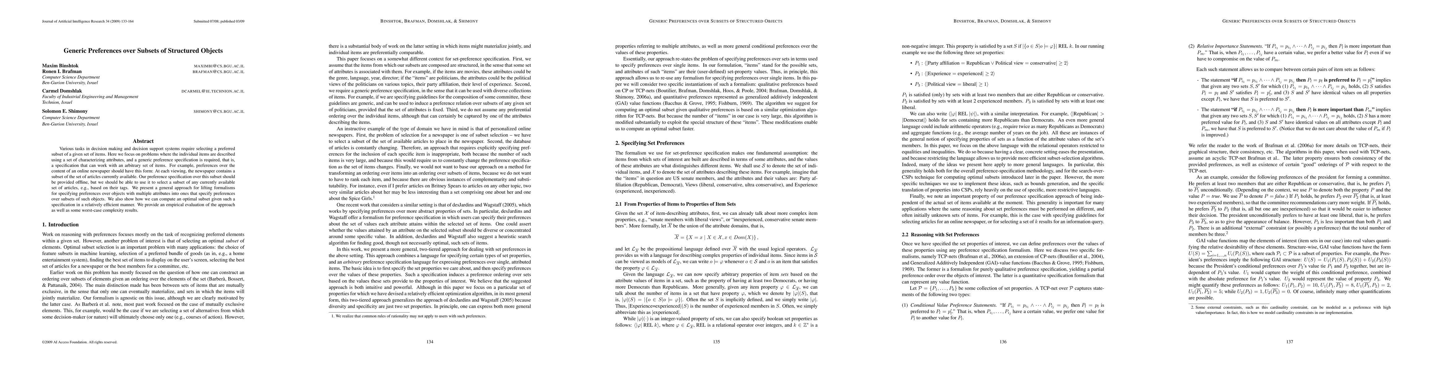 The paper presents a general approach to specifying preferences over subsets of structured objects with multiple attributes, enabling efficient computation of optimal subsets and an empirical evaluation.