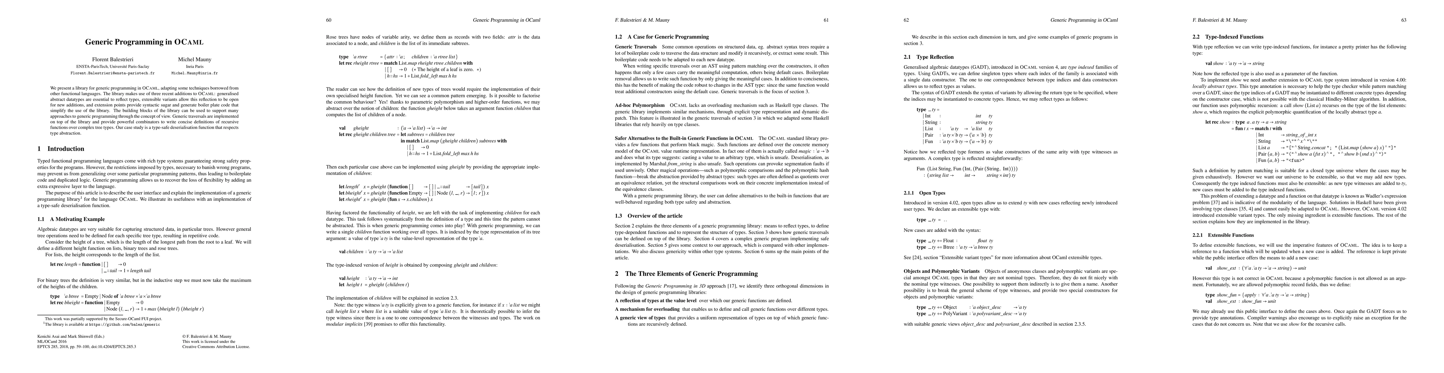 This paper introduces a library for generic programming in OCaml, utilizing recent language features like generalised abstract datatypes, extensible variants, and extension points. It implements generic traversals and demonstrates its effectiveness with a type-safe deserialization function.