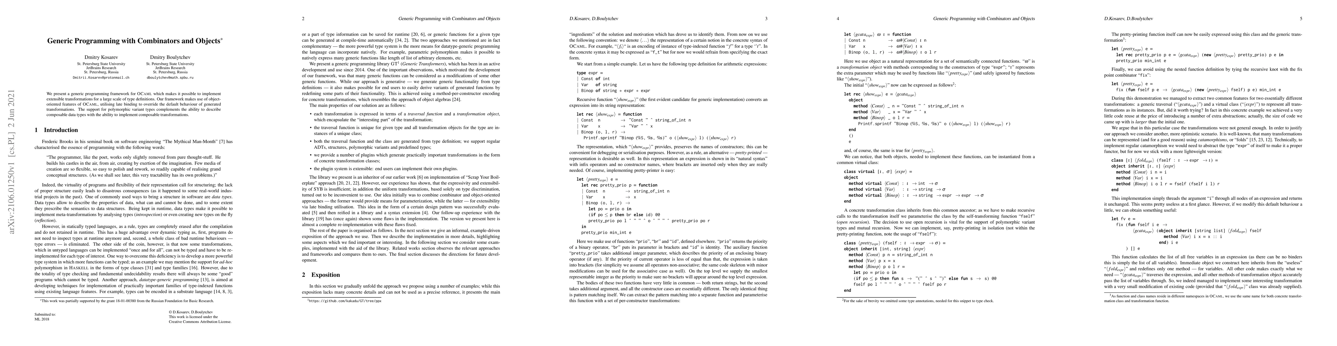 This paper introduces a generic programming framework in OCAML that leverages combinators and object-oriented features to implement extensible transformations across various type definitions, utilizing late binding and polymorphic variant types for flexibility and composability.